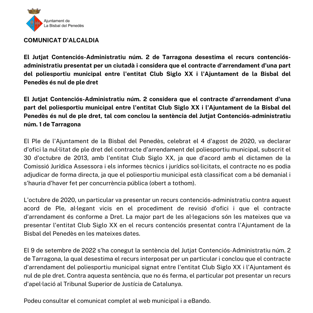 El 9 de setembre de 2022 s’ha conegut la sentència del Jutjat Contenciós-Administratiu núm. 2 de Tarragona, la qual desestima el recurs interposat per un particular i conclou que el contracte d’arrendament del poliesportiu municipal signat entre l’entitat Club Siglo XX i l’Ajuntament és nul de ple dret. Contra aquesta sentència, que no és ferma, el particular pot presentar un recurs d’apel·lació al Tribunal Superior de Justícia de Catalunya.