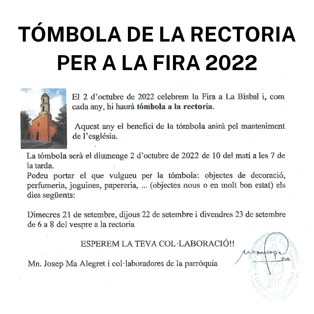La parròquia informa que, si voleu participar en la tómbola de la rectoria -que es farà durant ‘La Fira’- podeu portar els objectes que vulgueu donar el dimecres 21 de setembre, el dijous 22 de setembre i el divendres 23 de setembre, de 18h a 20h, a la rectoria (plaça de l’església).