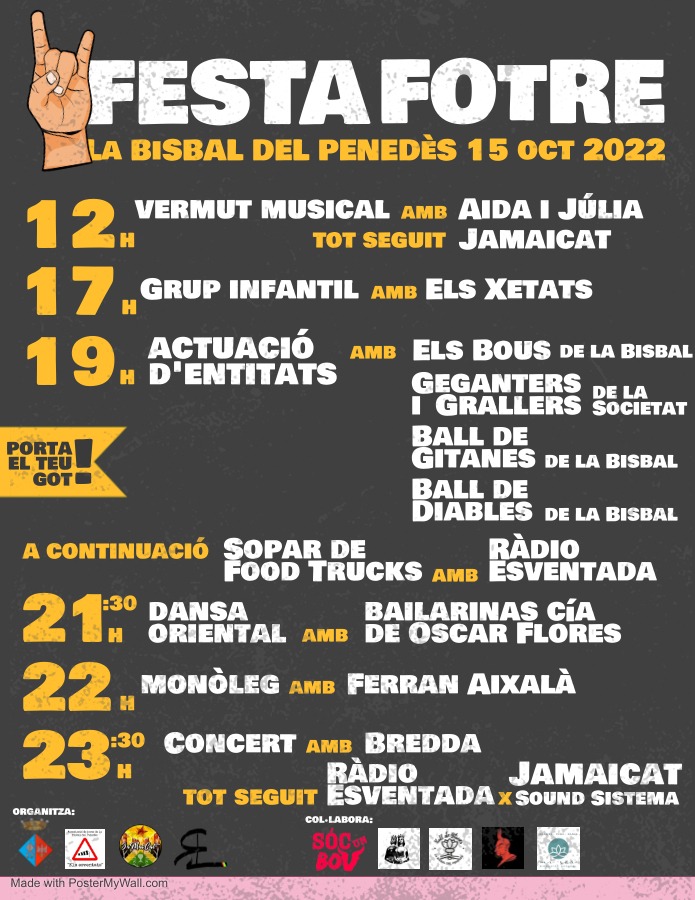 Los Esventats Bisbal están preparando una buena fiesta para el próximo sábado 15 de octubre, junto con Ràdio Esventada, Jamaicat Sound y el Ayuntamiento de la Bisbal del Penedès y con la colaboración de varias entidades. Aquí os dejamos el programa de actividades. ¡Guardaos la fecha!