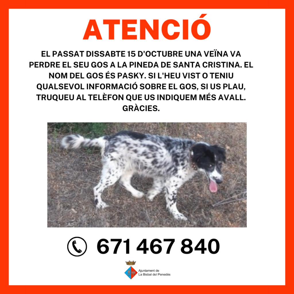 Aquest gos es va perdre el dissabte a la Pineda de Santa Cristina. Si l’heu vist o teniu informació sobre el gos, si us plau, truqueu al telèfon de la imatge. Moltes gràcies.