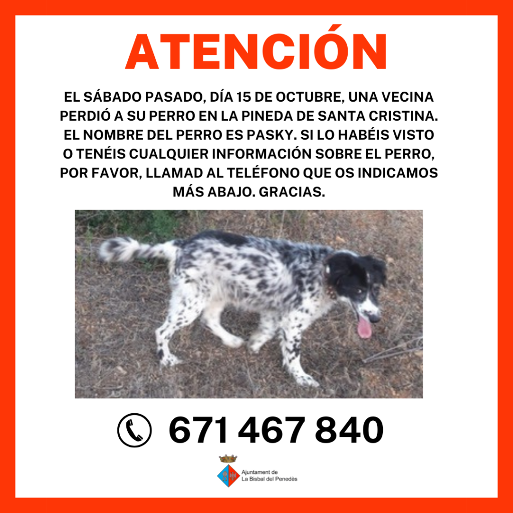 Este perro se perdió el sábado en la Pineda de Santa Cristina. Si lo habéis visto o tenéis información sobre el mismo, por favor, llamad al teléfono de la imagen. Muchas gracias.