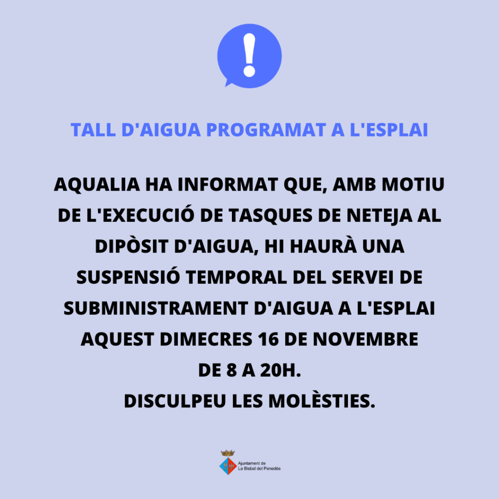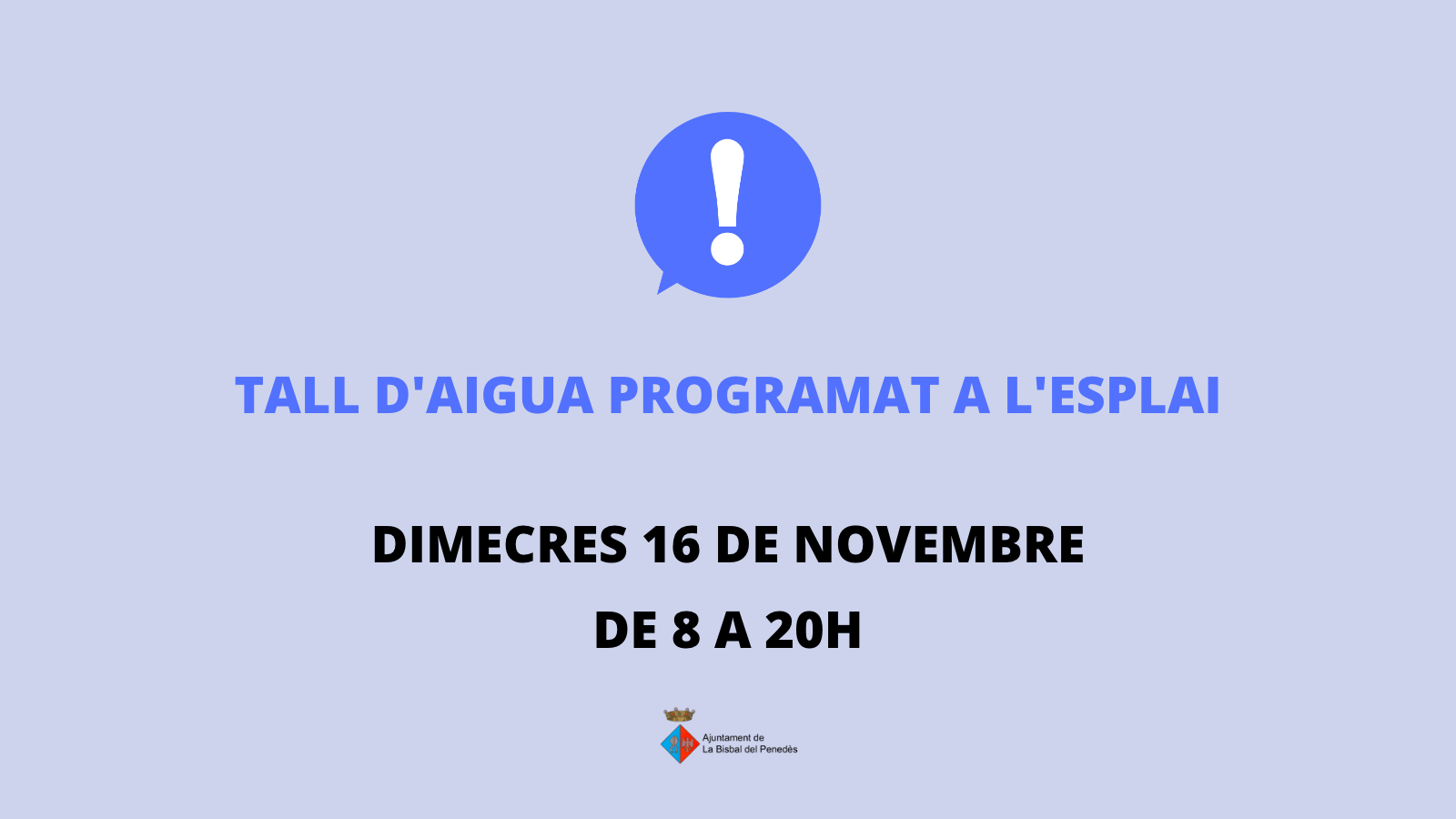 Avís de tall d’aigua programat a l’Esplai el dimecres 16 de novembre de 8 a 20h