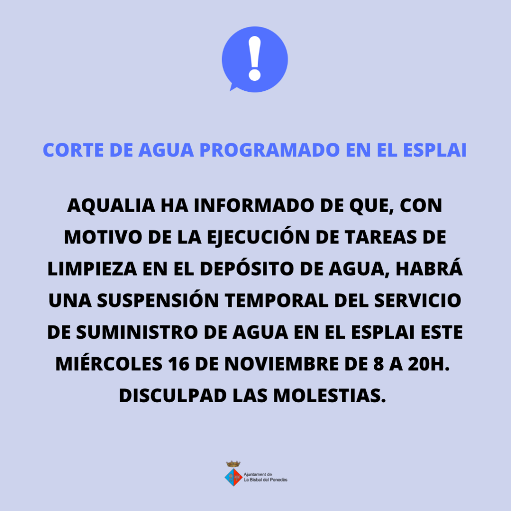Aqualia ha informado que, con motivo de las tareas de limpieza en el depósito del Esplai, este miércoles procederá a suspender el servicio, temporalmente, de 8 a 20h. Disculpad las molestias.