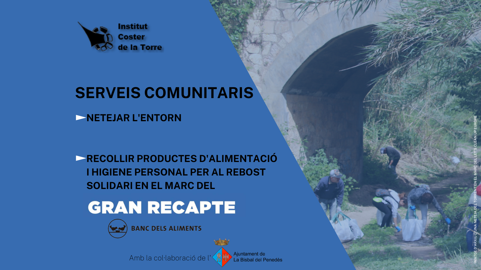 Cabe decir que, en el marco de los servicios comunitarios, los alumnos de 4º de ESO del Institut Coster de la Torre también llevarán a cabo una recogida de alimentos los días 25, 26 y 27 de noviembre, enmarcada en el ‘Gran recapte dels aliments’. Esta acción se llevará a cabo en conjunto con la Concejalía de Bienestar Social y los productos recogidos, en las cajas instaladas por los alumnos del instituto, se destinarán al ‘Rebost Solidari’.