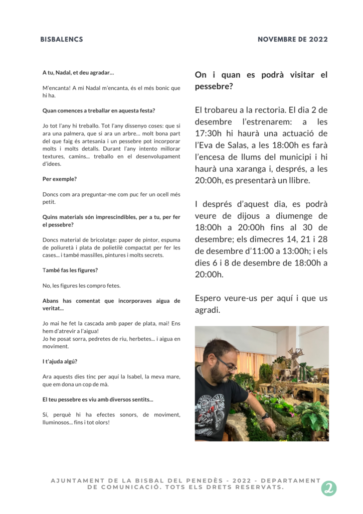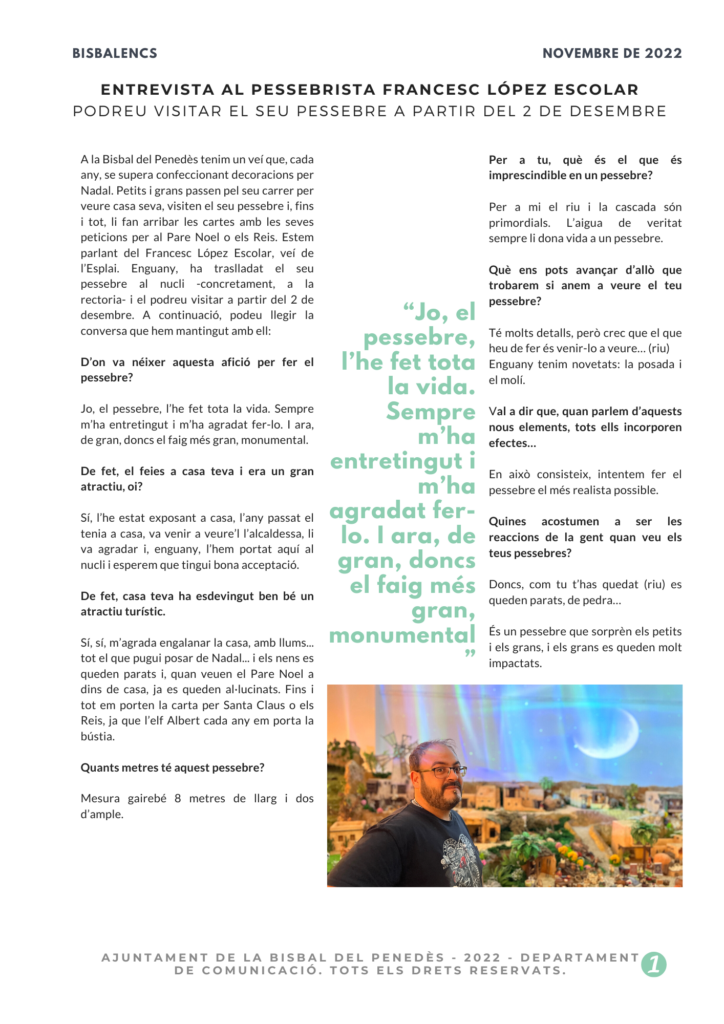 El proper divendres 2 de desembre obre les portes el pessebre del Francesc López Escolar, que es podrà visitar durant tot el mes de desembre a la rectoria. Aquesta és l’entrevista que li hem fet al pessebrista bisbalenc.