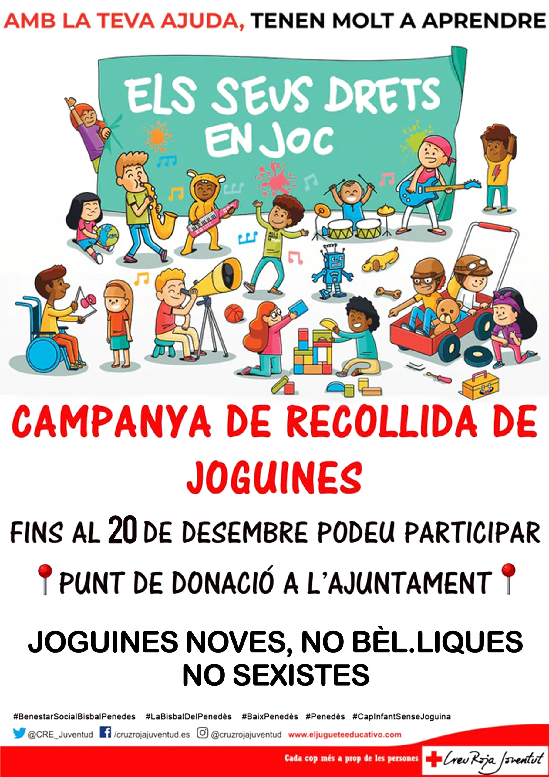 Un año más, el Ayuntamiento de la Bisbal del Penedès y la Cruz Roja llevamos a cabo una recogida de juguetes conjunta para que, por Navidad, todos los niños y niñas tengan juguetes. Podéis traer juguetes nuevos al punto de recepción que hemos colocado en la entrada del Ayuntamiento. Para más información, consultad el cartel adjunto.
