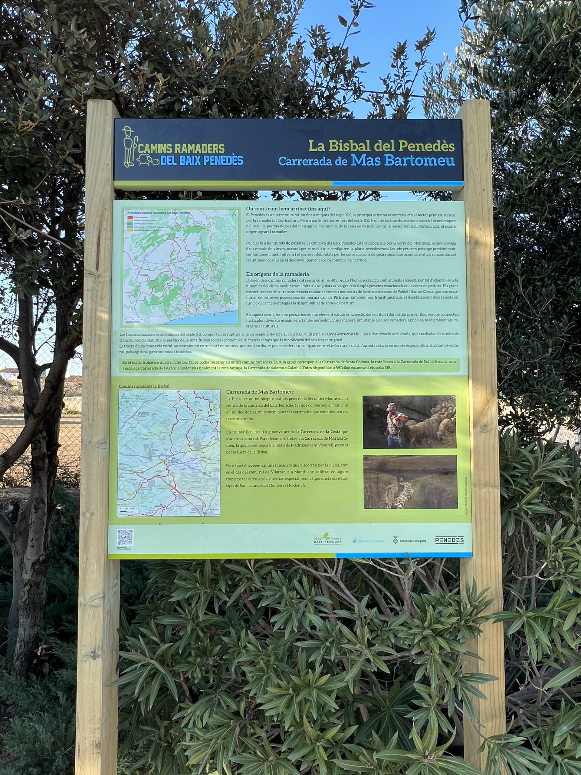 El cartel que se ha instalado en la Era de Batre (al lado del cartel informativo sobre el camino a Sant Magí de la Brufaganya) ofrece información sobre el Penedès, la ganadería y la trashumancia en nuestro territorio, las transformaciones económicas del siglo XX y la Cañada de Mas Bartomeu que, según explica el mismo cartel, “desemboca en la playa de las Madrigueres del Vendrell, pasando por la Riera de la Bisbal”. En el cartel también encontraréis información sobre el resto de caminos ganaderos de la comarca.
