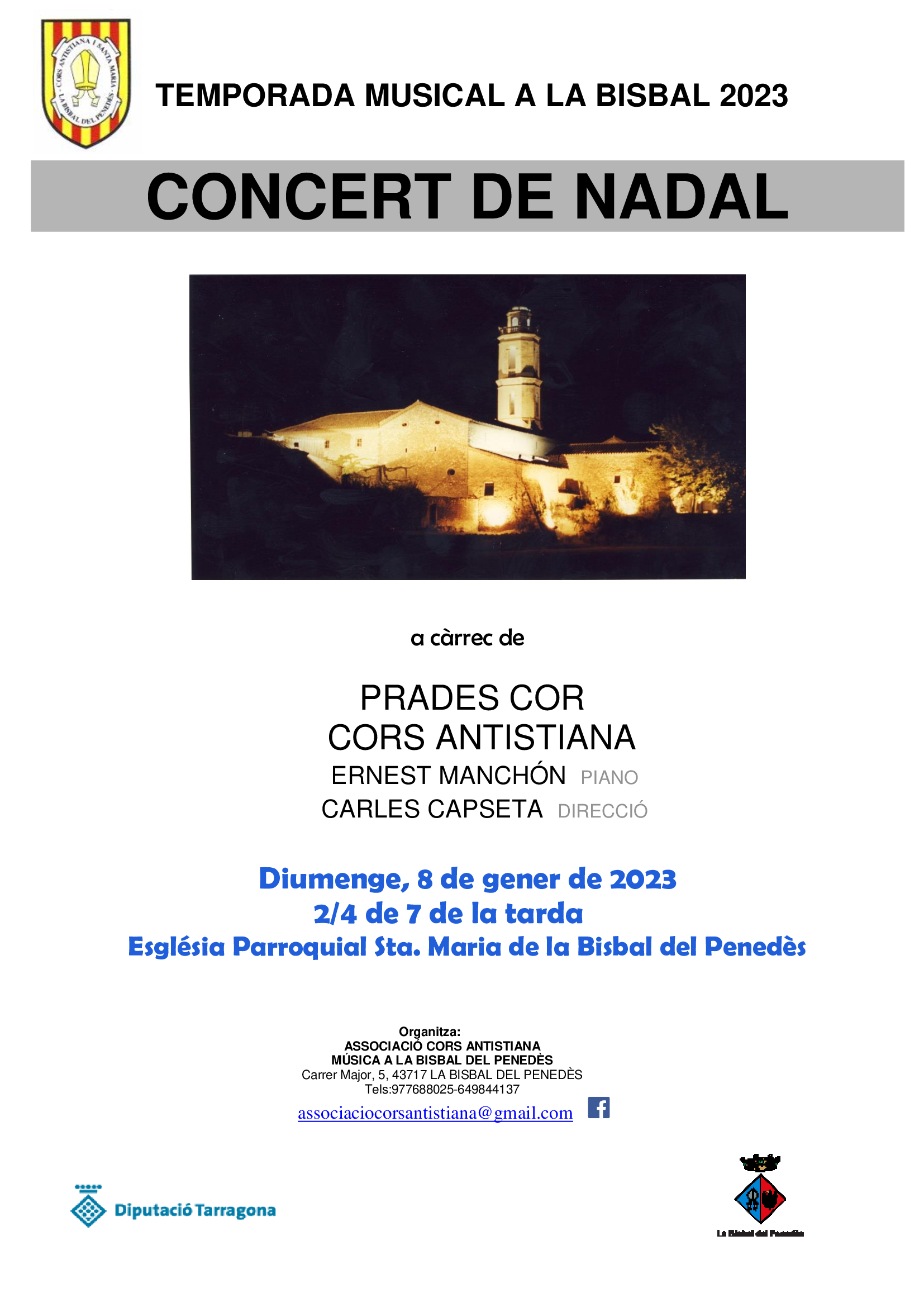 El diumenge, a les 18:30h podreu gaudir del concert a càrrec de Prades Cor, els Cors Antistiana i Ernest Manchón (piano), sota la direcció de Carles Capseta.