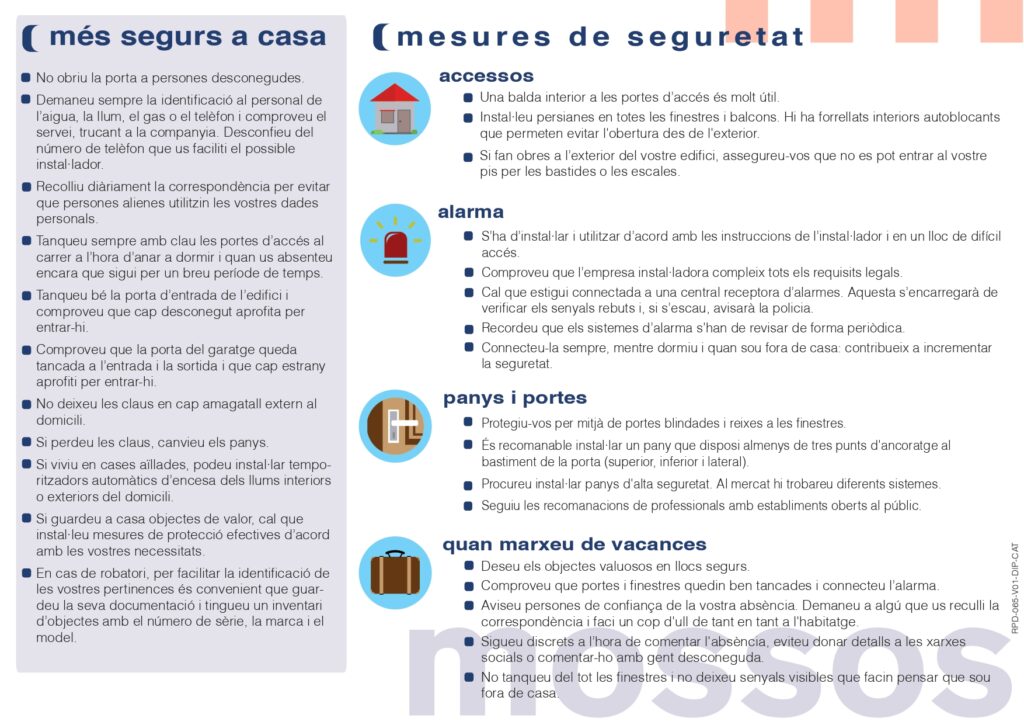 Des de l’Ajuntament de la Bisbal del Penedès us facilitem les recomanacions i mesures de prevenció i seguretat al domicili, editades per Mossos d’Esquadra.