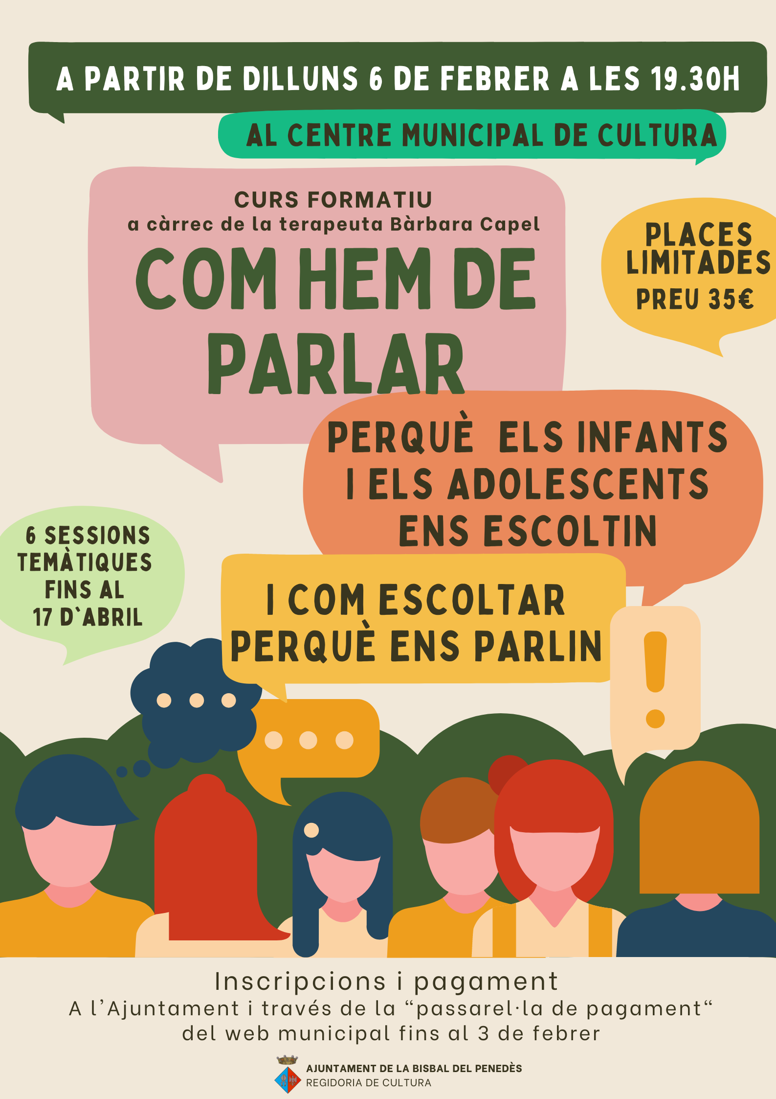 A partir del dilluns 6 de febrer, a les 19:30h, el Centre Municipal de Cultura acollirà el curs formatiu “Com hem de parlar perquè els infants i els adolescents ens escoltin i com escoltar perquè ens parlin”, que serà de 6 sessions quinzenals (fins al 17 d’abril).