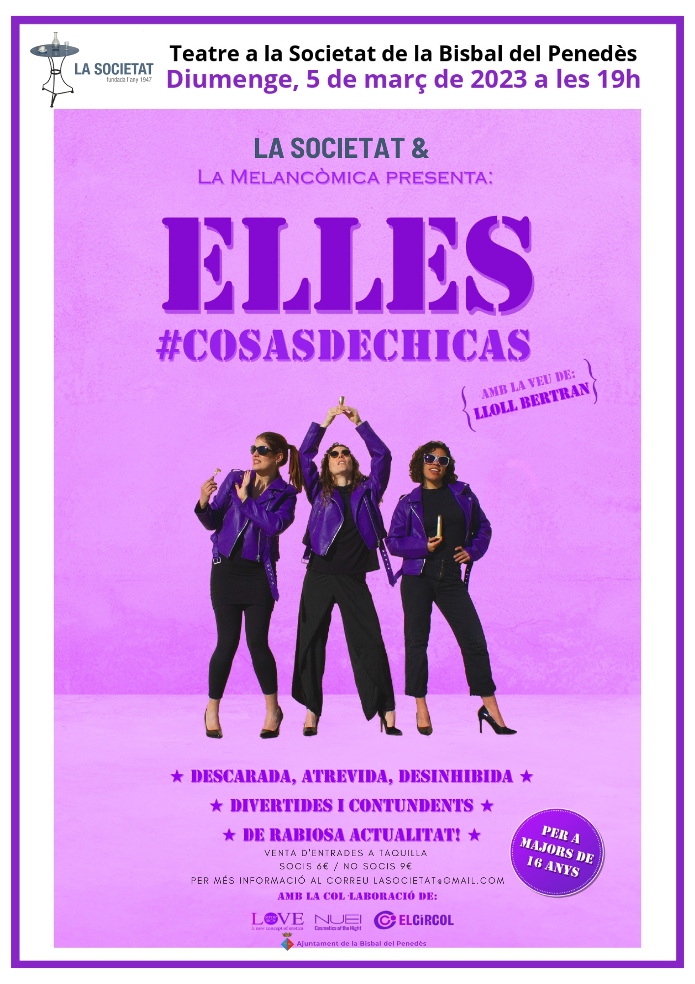 El proper diumenge 5 de març, a les 19h, podreu gaudir de l’obra de teatre “Elles #CosasDeChicas” a la Societat Cultural i Recreativa Bisbalenca. Més informació al cartell adjunt.