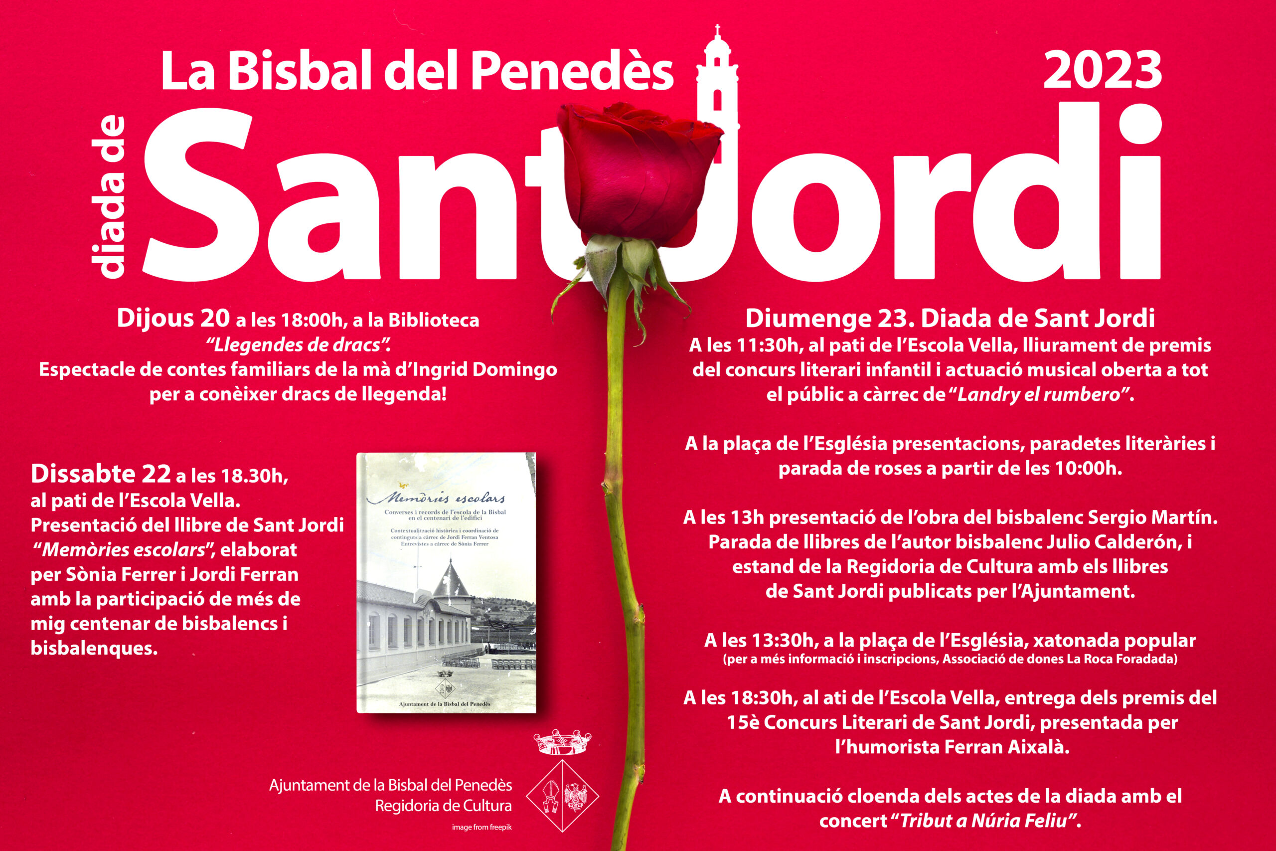 A las 18:30h, en el patio de la escuela vieja, entrega de los premios del 15º Concurso Literario de Sant Jordi, presentada por el humorista Ferran Aixalà. A continuación, clausura de los actos de la diada con el concierto “Tribut a Núria Feliu”.