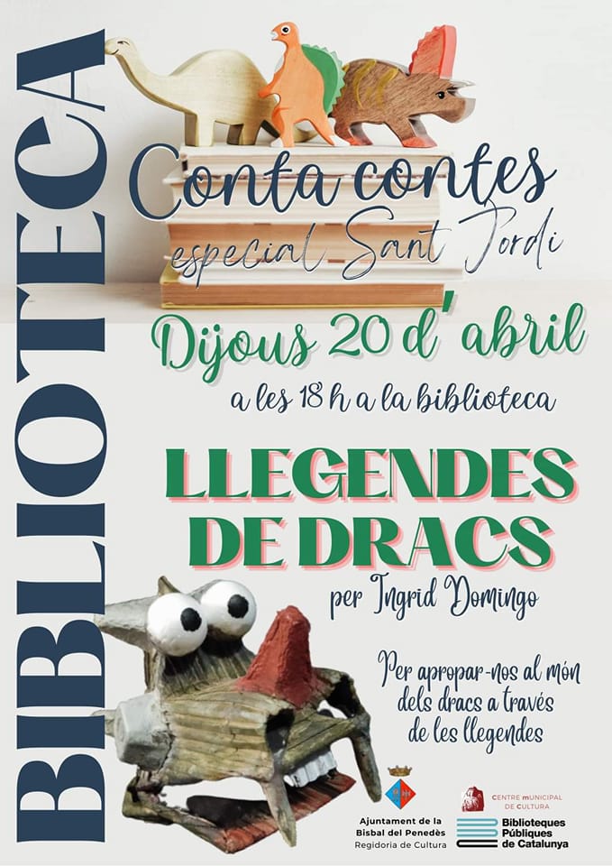 Avui dijous 20 d’abril, a les 18h, podreu gaudir de les “Llegendes de Dracs” amb l’Ingrid Domingo a la Biblioteca pública de la Bisbal del Penedès.
