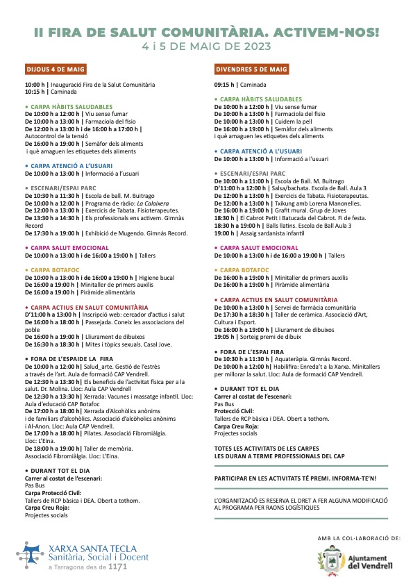 A partir de demà dijous se celebra la II Fira de Salut Comunitària de l’ABS El Vendrell al parc del costat del CAP del carrer Transversal. Us adjuntem el programa amb les activitats previstes per si hi esteu interessats.