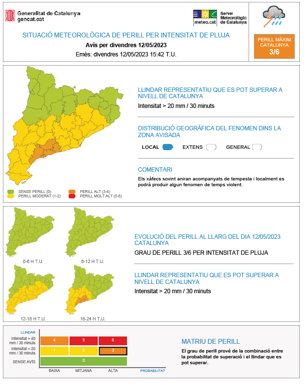 Avís per intensitat de pluja fins a la mitjanit. Els xàfecs van acompanyats de tempesta i localment poden anar acompanyats de calamarsa.