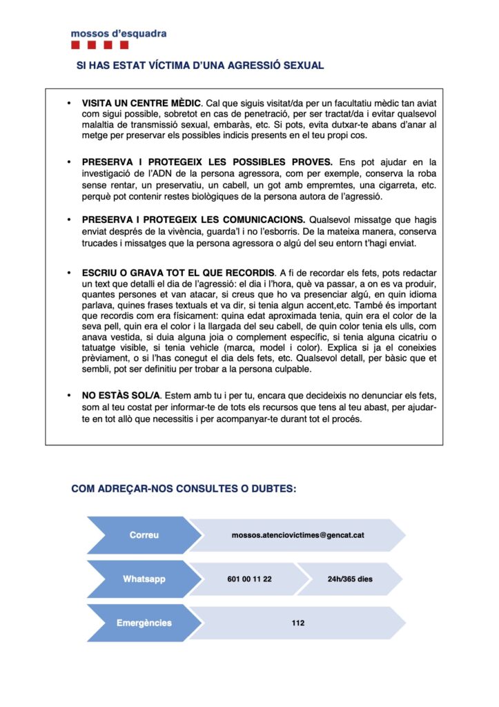 En caso de que veáis situaciones que puedan poneros en riesgo a vosotros o a vuestro entorno, llamad a los Mossos d’Esquadra para dar el aviso.