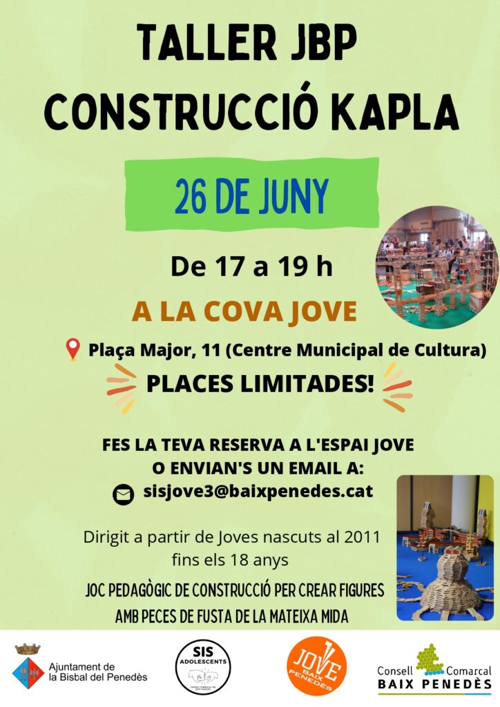 El próximo lunes 26 de junio, a las 17h, la Cova Jove acogerá un taller de contrucción kapla para jóvenes de 12 a 18 años. ¡No esperéis a última hora para apuntaros, las plazas son limitadas!