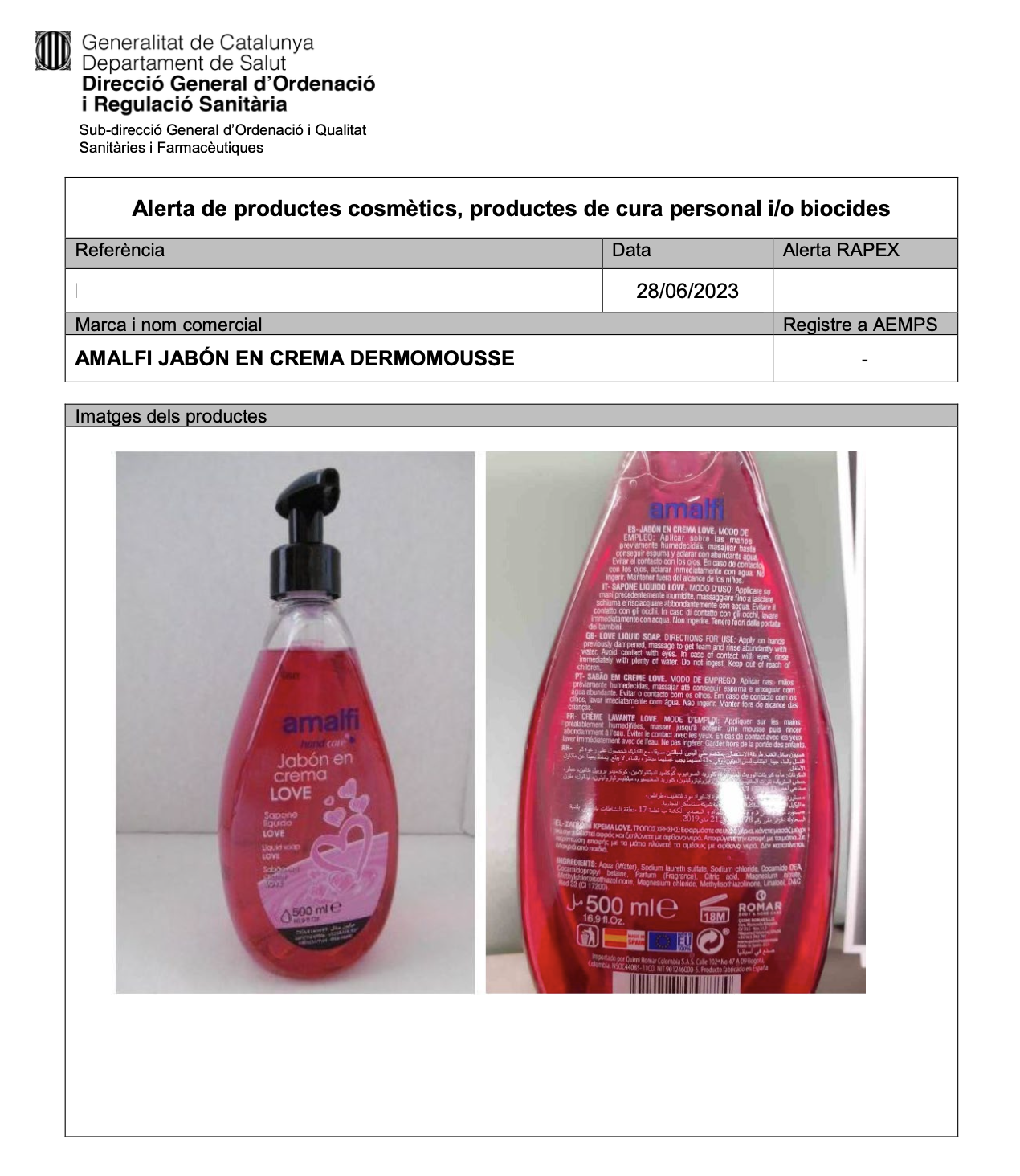 La Generalitat de Catalunya, des del Departament de Salut, ens demana que fem difusió de l’alerta sobre el producte Amalfi Jabón en Crema Dermomousse.
