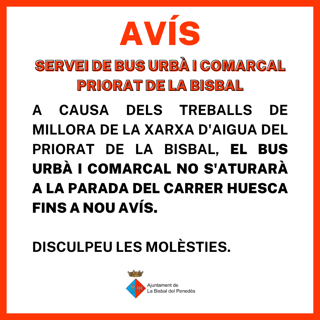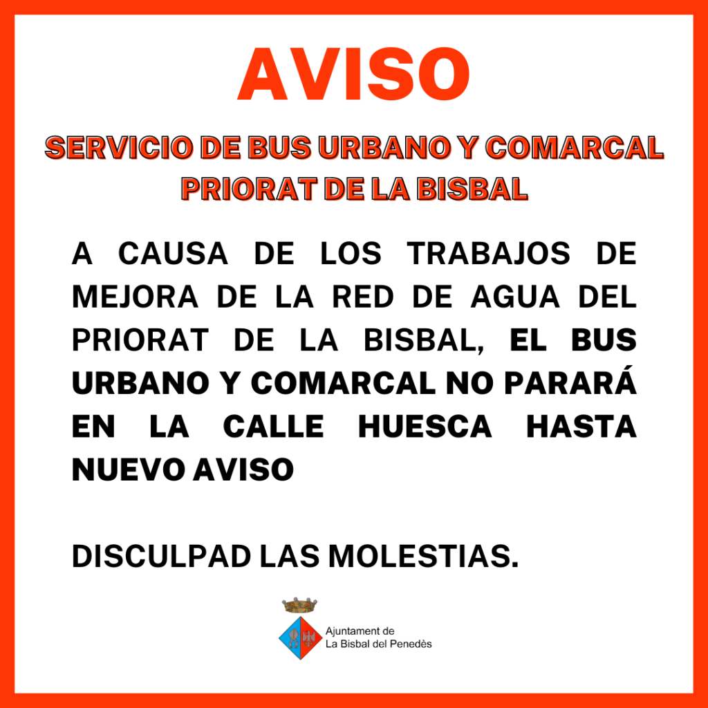 A causa de las obras para la mejora de la red de agua del Priorat de la Bisbal, el bus urbano no parará en la calle Huesca hasta nuevo aviso. Disculpad las molestias.