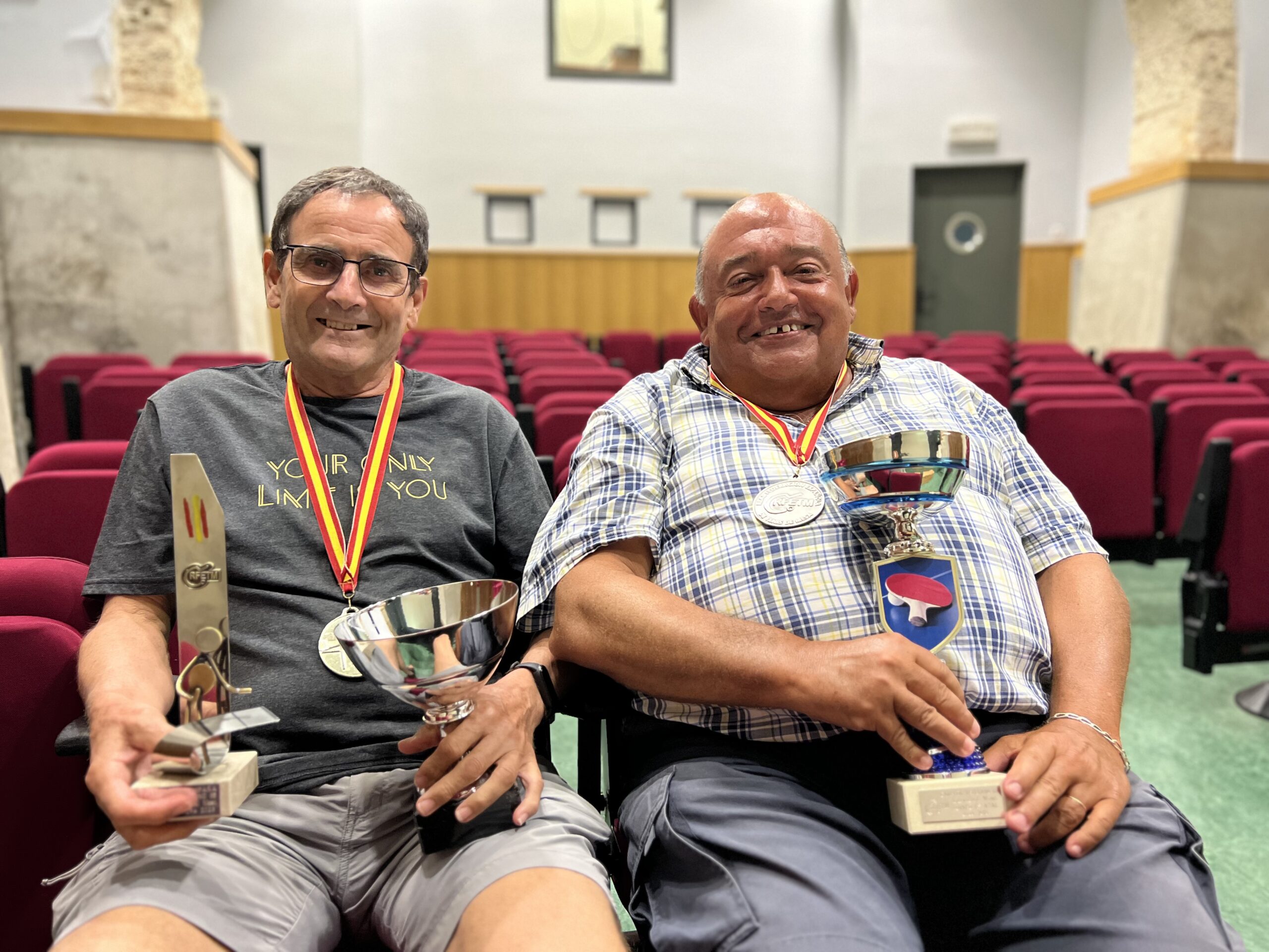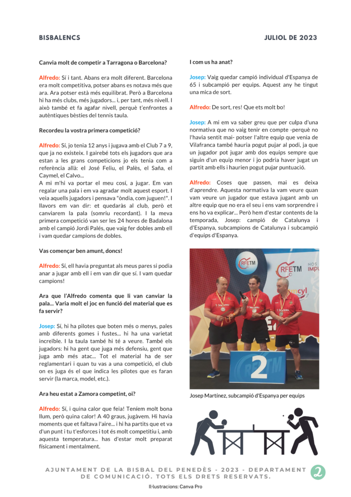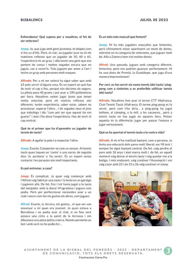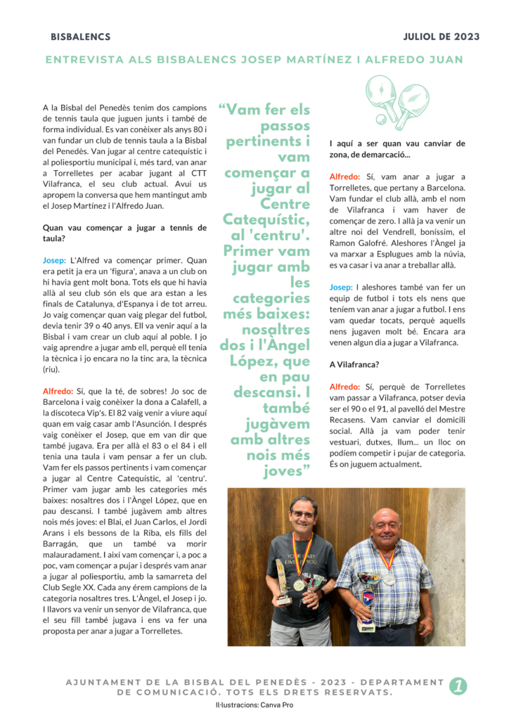 CASTELLANO | En la Bisbal del Penedès tenemos a dos campeones de tenis de mesa que juegan juntos y también de forma individual. Se conocieron en los años 80 y fundaron un club de tenis de mesa en la Bisbal del Pene`des. Jugaron en el “Centre Catequístic” y en el polideportivo municipal y, más tarde, fueron a Torrelletes para acabar jugando en el CTT Vilafranca, su club actual. Hoy os acercamos la conversación que hemos mantenido con Josep Martínez y Alfredo Juan.
