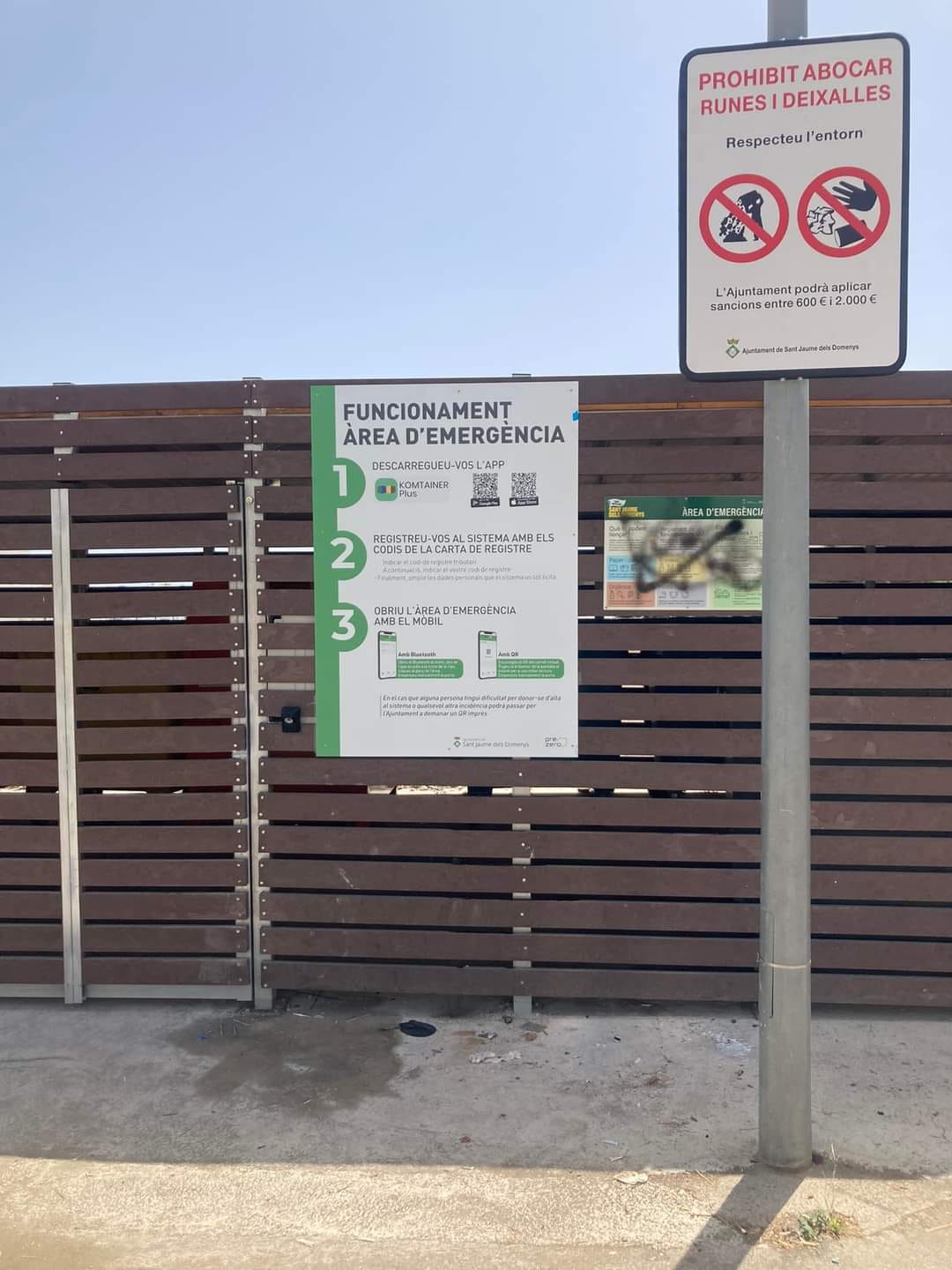 El Ayuntamiento de Sant Jaume también ha informado de que queda prohibido dejar residuos en las puertas de las áreas: están vídeo vigiladas y esta infracción supondrá una multa de entre 600€ y 2000€.