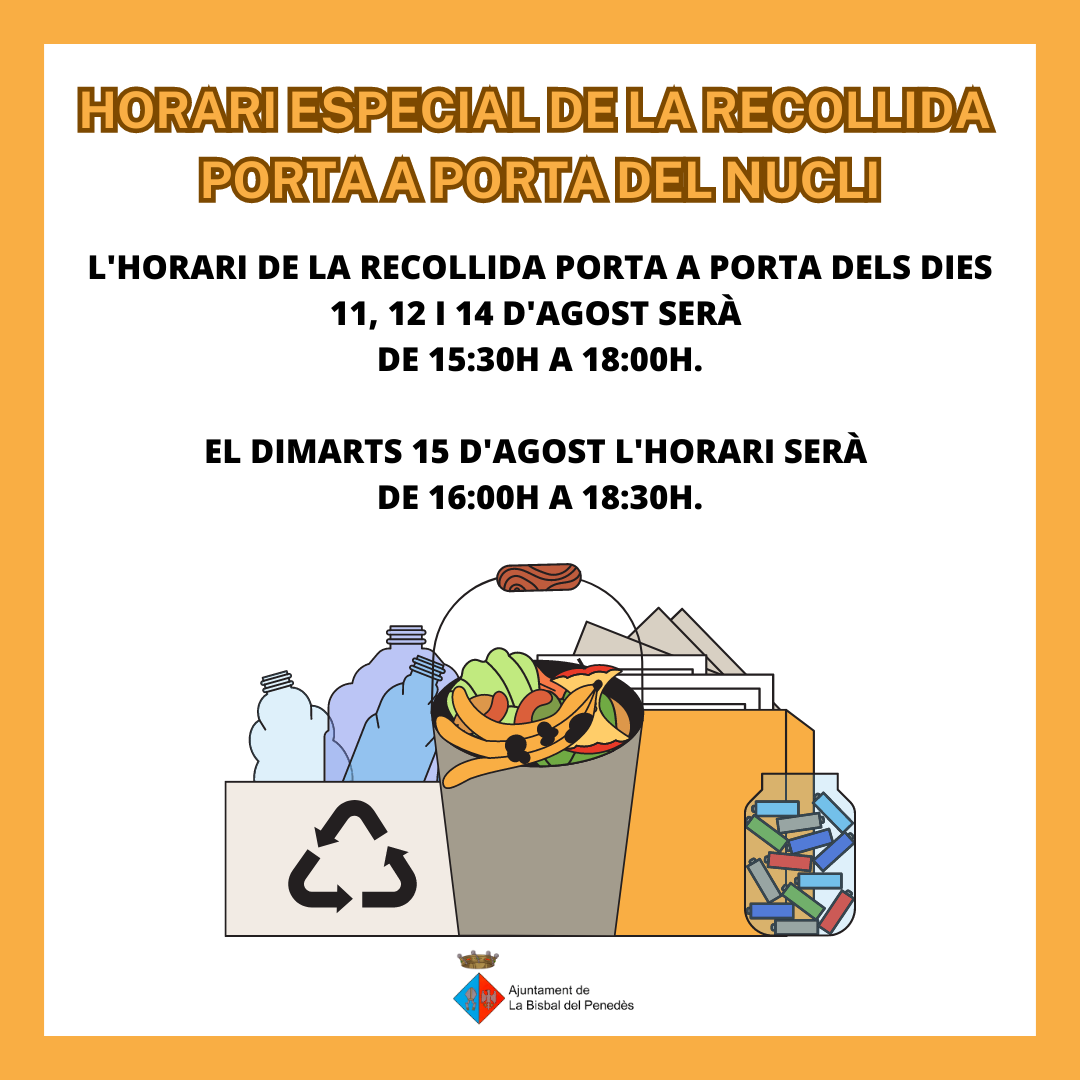 Horari excepcional de la recollida de residus porta a porta al nucli els dies 11, 12, 14 i 15 d’agost