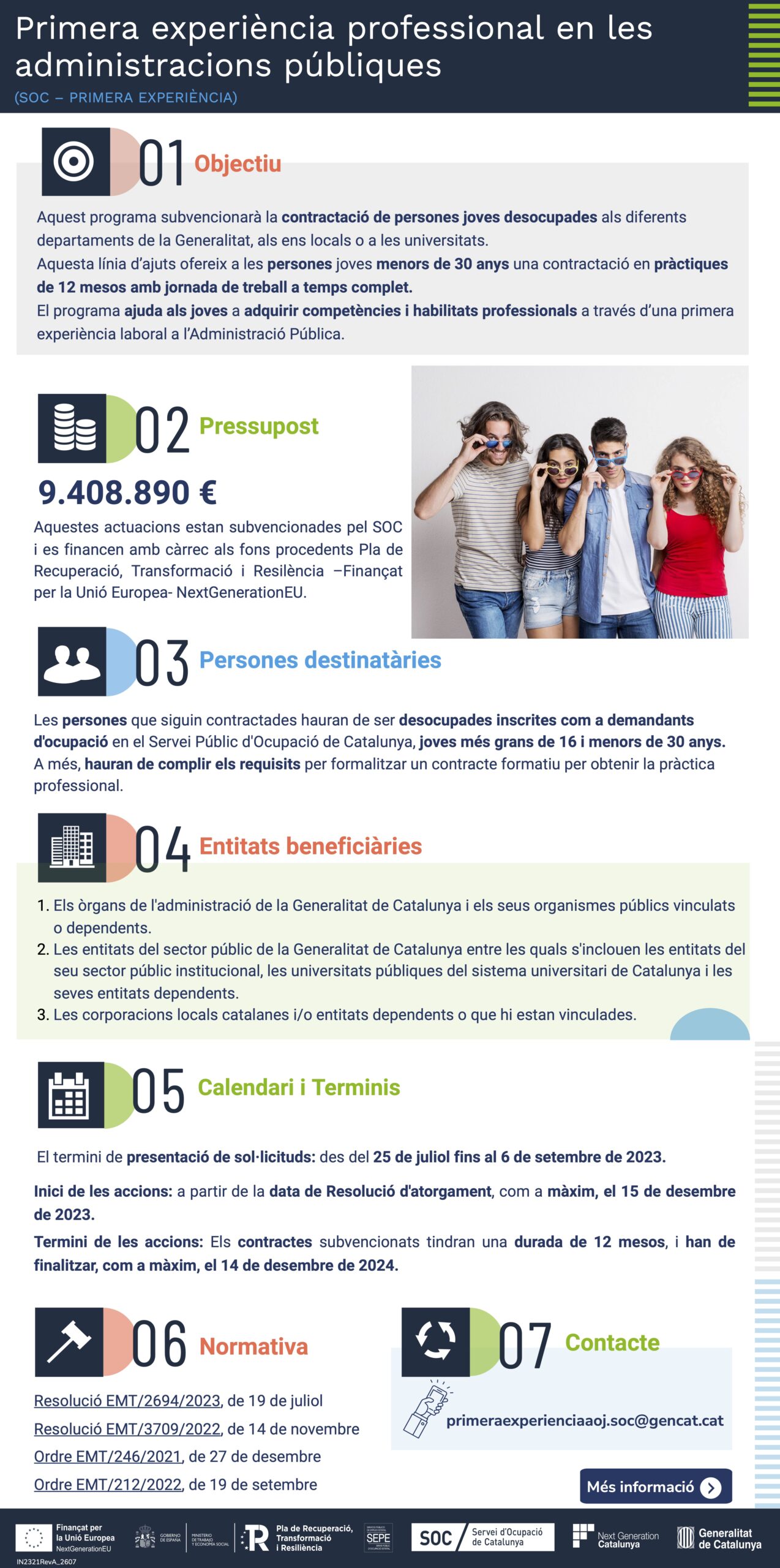 CASTELLANO | La Junta de Gobierno del 7 de agosto, a petición de las concejalías de Ocupación y Juventud, aprobó solicitar la subvención para la contratación de dos jóvenes en el marco de la convocatoria 2023 del programa de primera experiencia profesional en las administraciones públicas. Concretamente, se han solicitado dos perfiles al Servei d’Ocupació de Catalunya (SOC): un/a técnico/a de turismo y patrimonio cultural y un/a técnico/a de educación infantil.