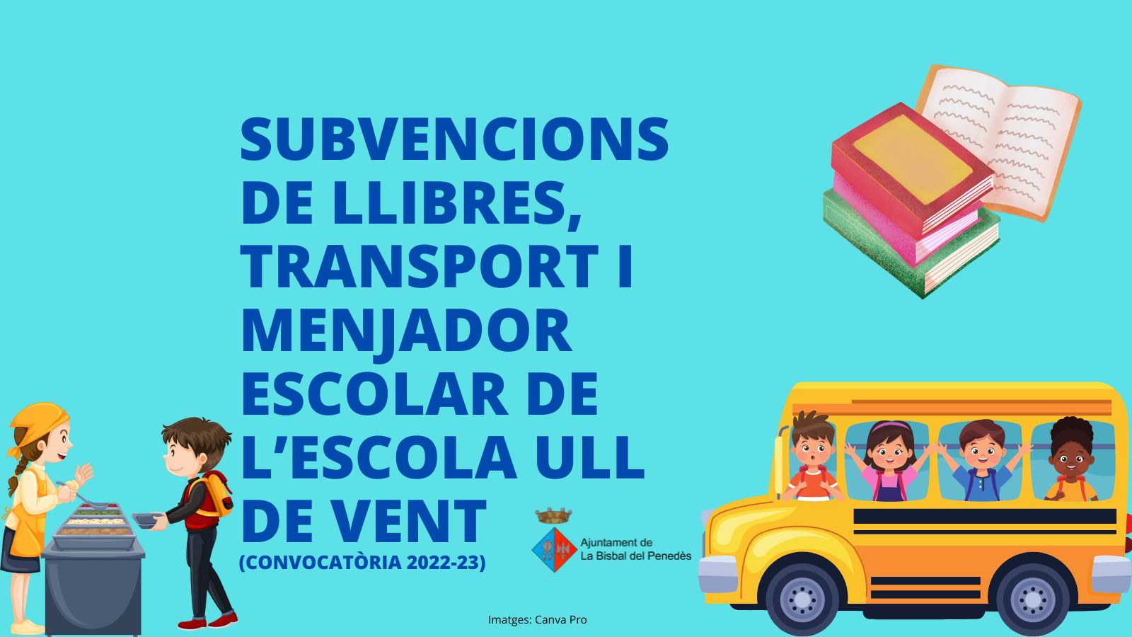 El proper dimarts 12 de setembre s’obrirà el termini per sol·licitar les subvencions per a l’adquisició de llibres de text de l’Escola Ull de Vent (mitjançant socialització de llibres), del menjador escolar i del transport escolar (curs 2022-2023).