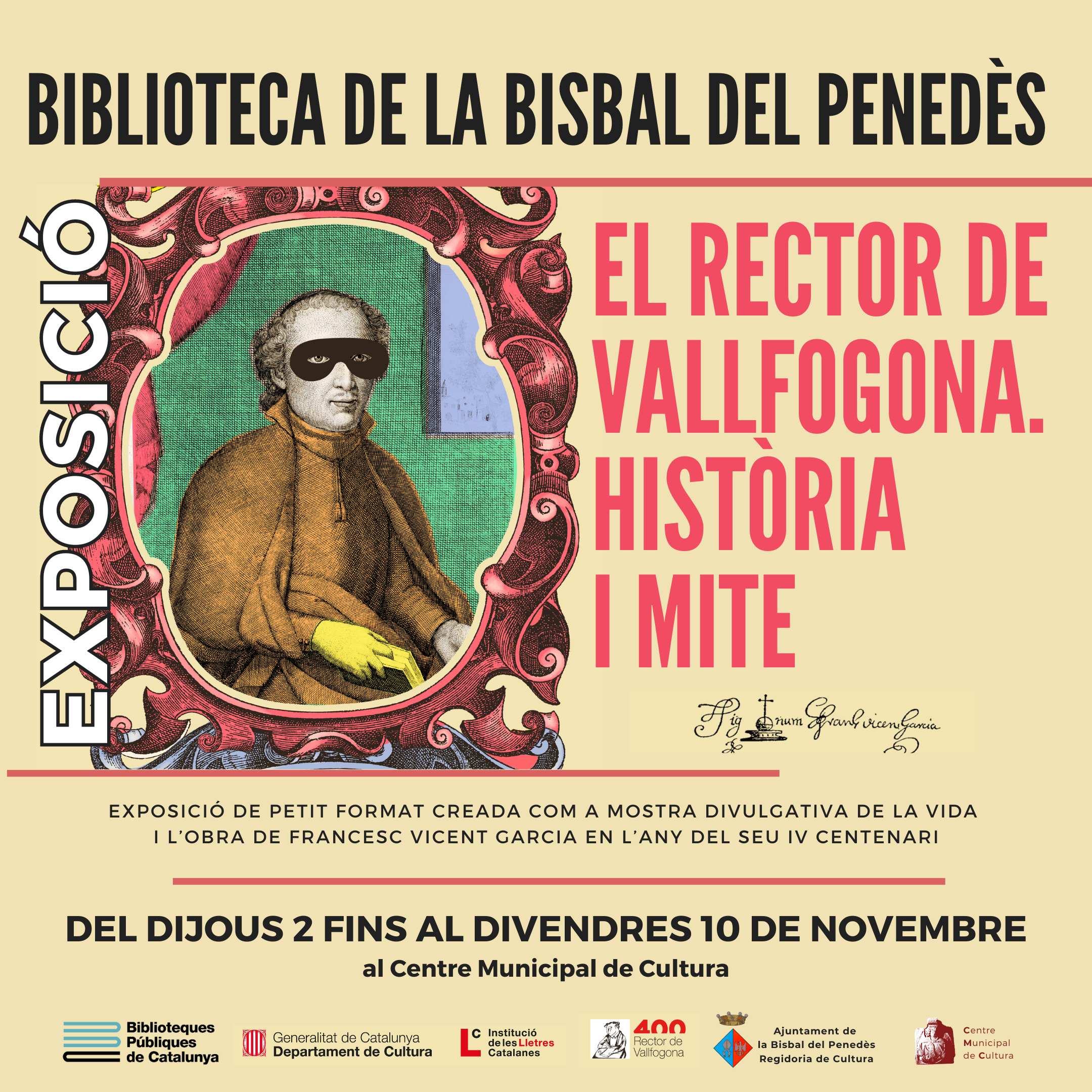 CASTELLANO | A partir del próximo jueves 2 de noviembre podéis visitar la exposición de pequeño formato “El Rector de Vallfogona. Història i mite” en el vestíbulo de la Biblioteca pública de la Bisbal del Penedès. La exposición ha sido comisariada por el poeta Josep Pedrals y está dedicada a la vida y obra de Francesc Vicent Garcia, con motivo de los actos del cuatricentenario de la muerte del escritor. Paralelamente, encontraréis un pequeño expositor bibliográfico dedicado a su obra en el interior de la biblioteca.
