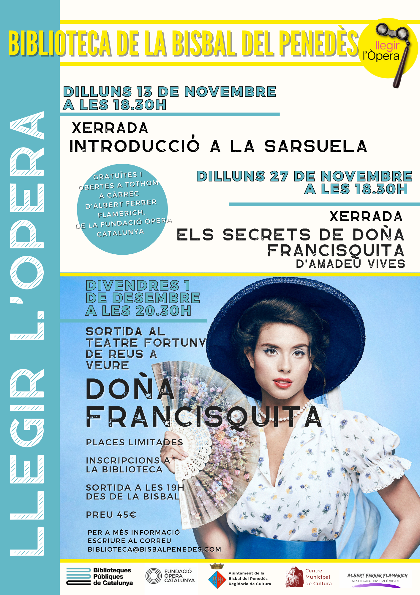 - El dilluns 27 de novembre, a les 18:30h: xerrada “Els secrets de Doña Francisquita d’Amadeu Vives” a càrrec d’Albert Ferrer i Flamarich de la Fundació Òpera Catalunya. Activitat gratuïta. Places limitades.