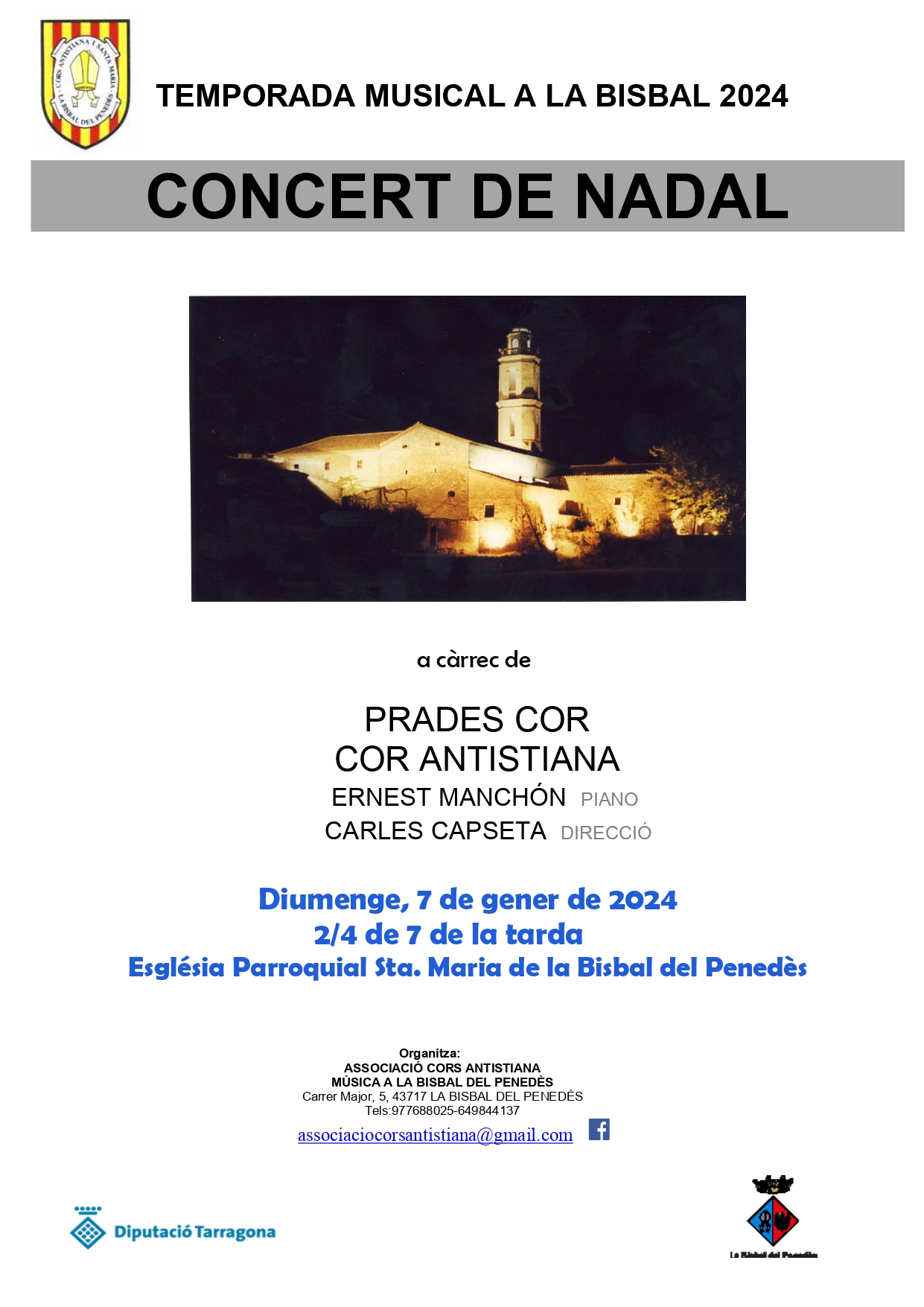 A les 18:30h podreu gaudir del concert a càrrec de Prades Cor, els Cors Antistiana i Ernest Manchón (piano), sota la direcció de Carles Capseta.