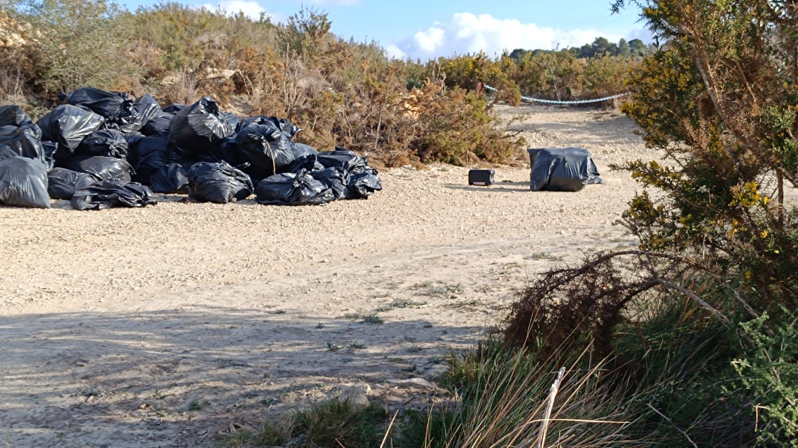CASTELLANO | Entre hoy jueves y mañana viernes, las concejalías de Medio Ambiente y Gestión de Residuos procederán a retirar este abandono de residuos en el medio ambiente. Este vertido, ubicado detrás del camino de la cruz de piedra, no se ha podido retirar hasta ahora porque el contenido de las bolsas son restos de una plantación ilegal de marihuana y se estaba a la espera de que la Guardia Civil viniese a hacer un informe -previo a su retirada- para obtener pistas sobre la procedencia de estas bolsas. Como hoy han venido los agentes que llevan a cabo la investigación, ahora ya se pueden retirar estos residuos.
