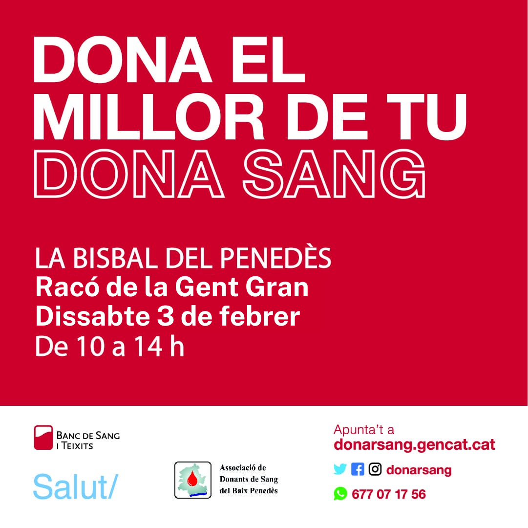 Podeu reservar hora al web https://donarsang.gencat.cat/ca/vull-donar/cita/recollida/poblacio//10675/la-bisbal-del-penedes/03-02-2024/