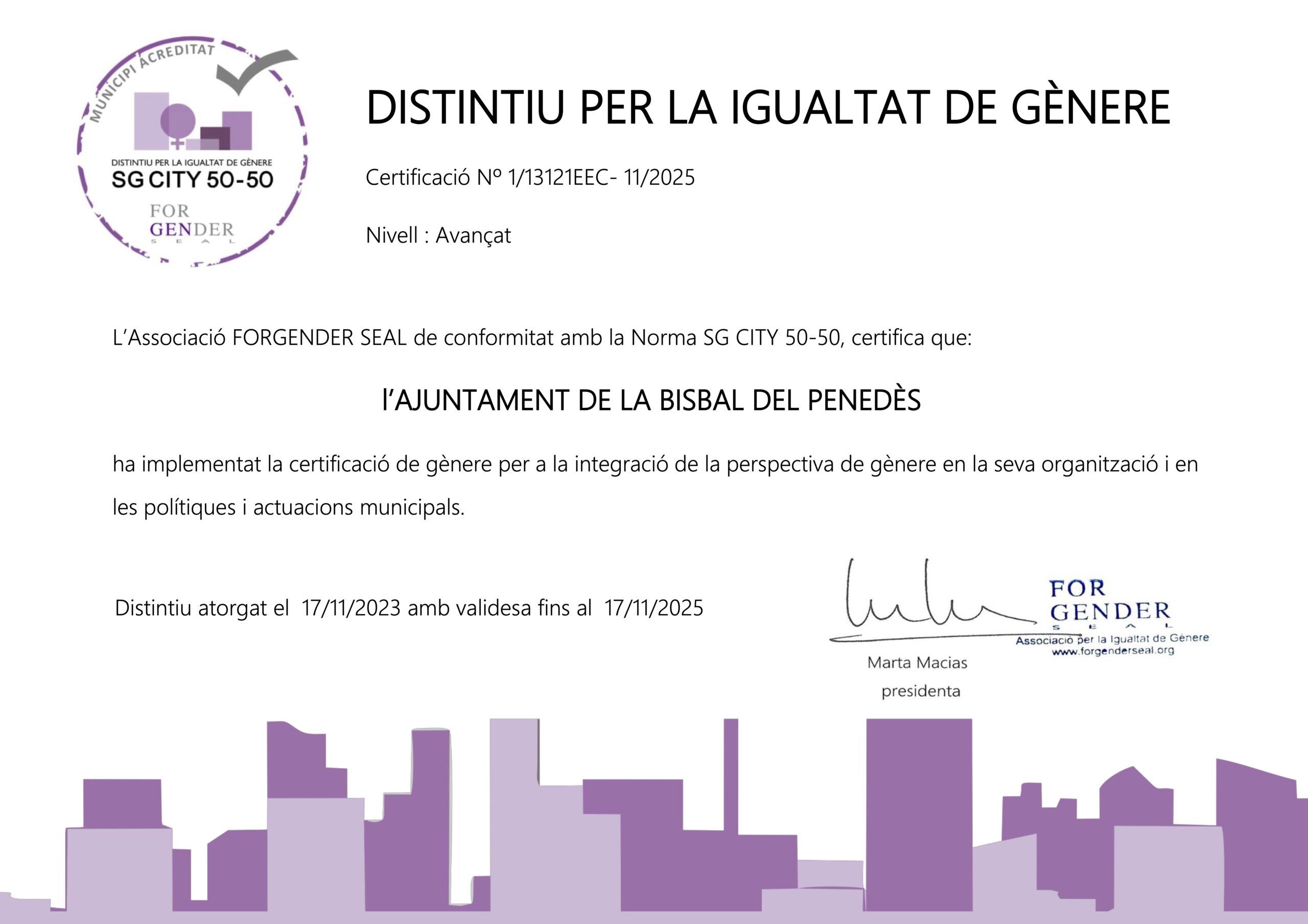 CASTELLANO | El Ajuntament de la Bisbal del Penedès ha conseguido la certificación SG CITY 50-50 (avanzado) de la asociación Forgender Seal. Este distintivo certifica la integración de la perspectiva de género en la organización y en las políticas y actuaciones municipales y tiene validez hasta noviembre de 2025.