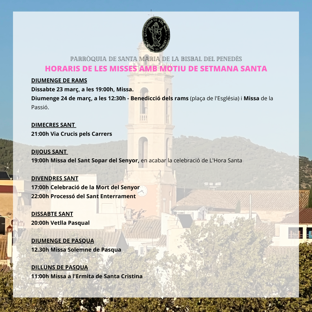 Des de la Parròquia de Santa Maria de la Bisbal del Penedès ens fan arribar els horaris de les misses de Setmana Santa. Podeu consultar-los a la imatge adjunta.