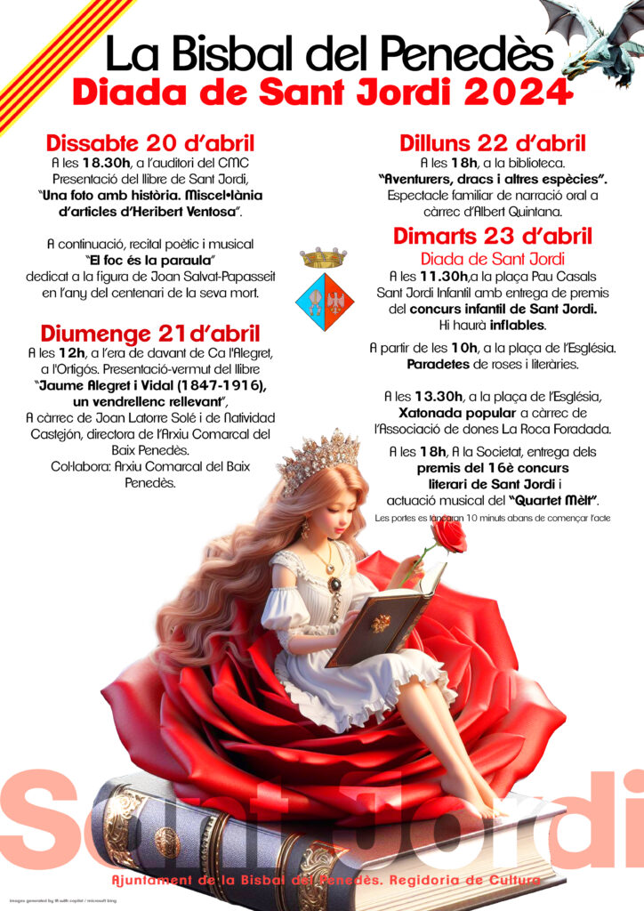 Us recordem que aquest dimarts 23 d’abril és festiu a La Bisbal del Penedès. Per aquest motiu, les oficines municipals, la Biblioteca pública de la Bisbal del Penedès, els centres educatius i el consultori mèdic romandran tancats. Que tingueu molt bona diada! I no us perdeu els actes que us hem preparat!