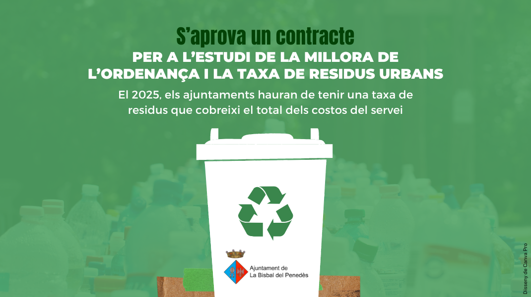 La Junta de Govern local del 30 d’abril va aprovar, a petició de la Regidoria de Residus, el contracte amb Ent Environment & Management, per a l’estudi de millora de l’ordenança i la taxa de residus urbans, per un import de 12.221€ (IVA inclòs). Aquest estudi es durà a terme durant 4 mesos, per tal que posteriorment l’Ajuntament de la Bisbal del Penedès aprovi l’ordenança i la taxa en base a aquest estudi.