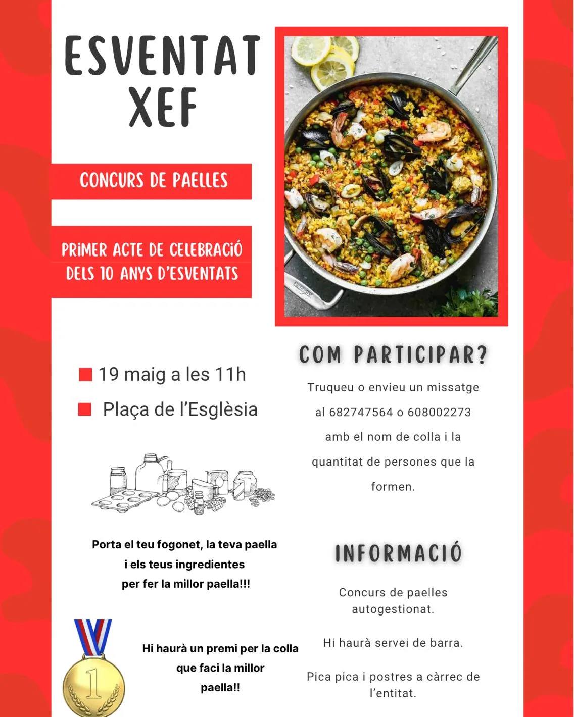 L’Associació de Joves Els Esventats ha organitzat un concurs de paelles. Es durà a terme el 19 de maig, a les 11h, a la plaça de l’Església. Al cartell trobareu els telèfons per fer la vostra inscripció (es pot fer fins al mateix dia).