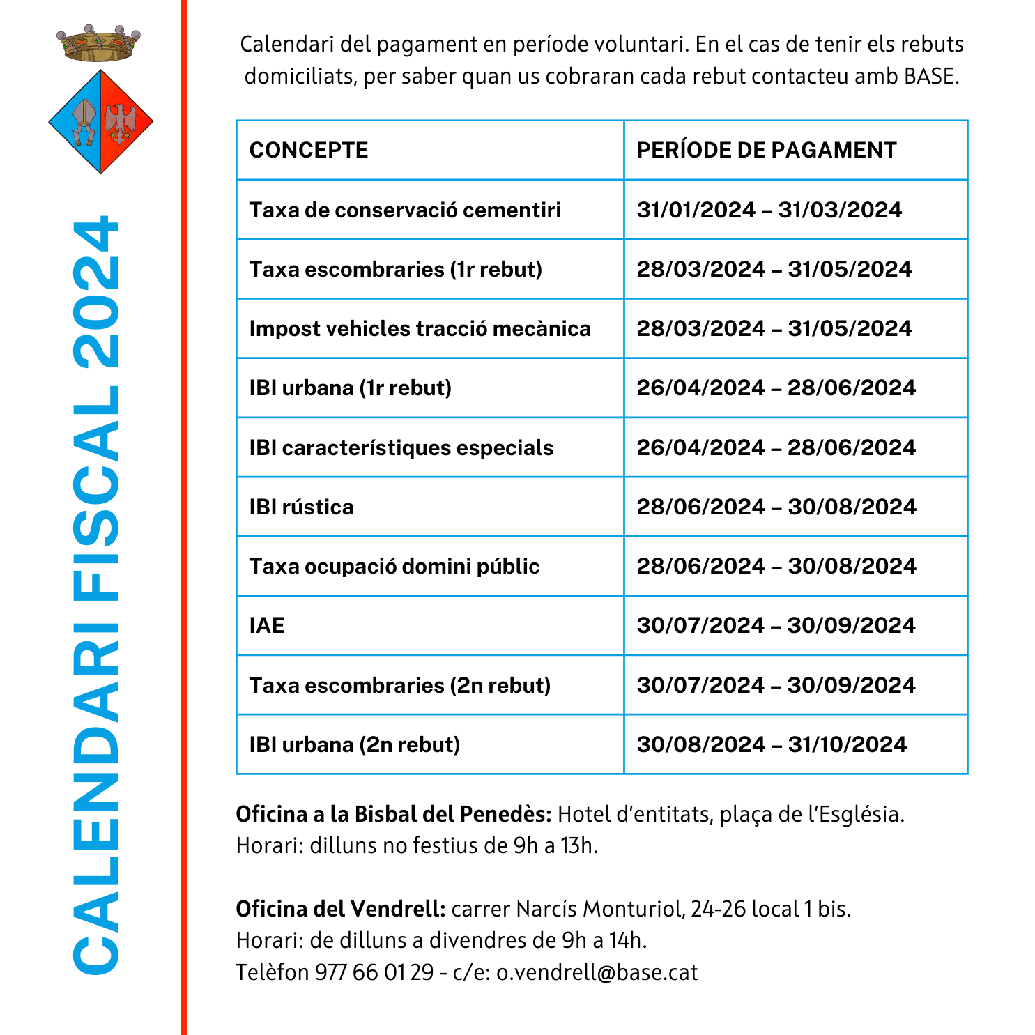 Calendari fiscal 2024: el 31 de maig finalitzen 2 terminis del període voluntari d’abonament de taxes i impostos municipals