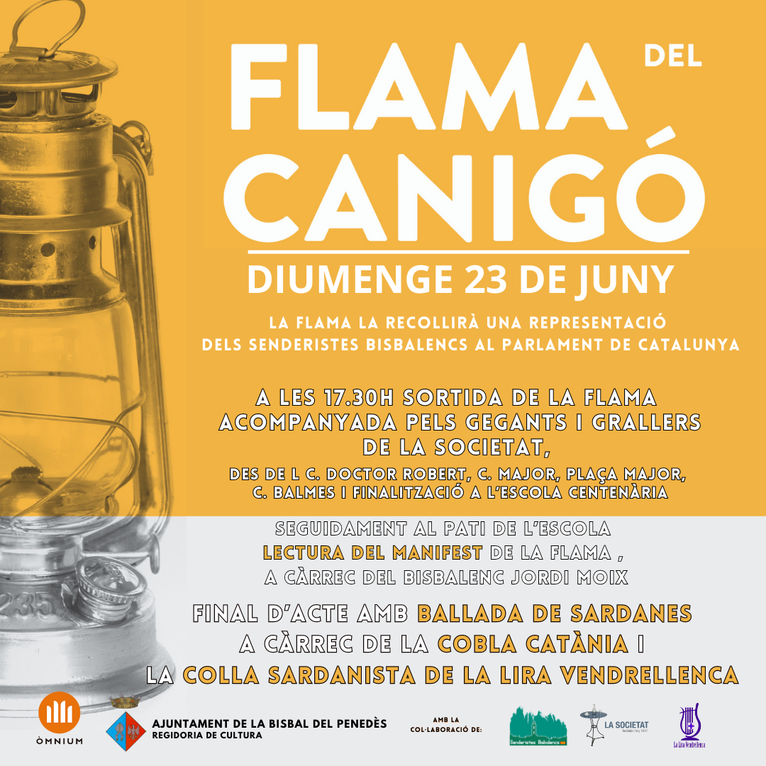 CASTELLANO | El próximo domingo 23 de junio. Senderistes Bisbalencs nos volverán a traer la Flama del Canigó y, junto con los Geganters i grallers de la Societat Cultural i Recreativa Bisbalenca, la conduciremos en pasacalle hasta la escuela centenaria, donde el bisbalenc Jordi Moix leerá el manifiesto y, a continuación, habrá sardanas con la Cobla Catania y la Colla Sardanista de la Lira Vendrellenca.