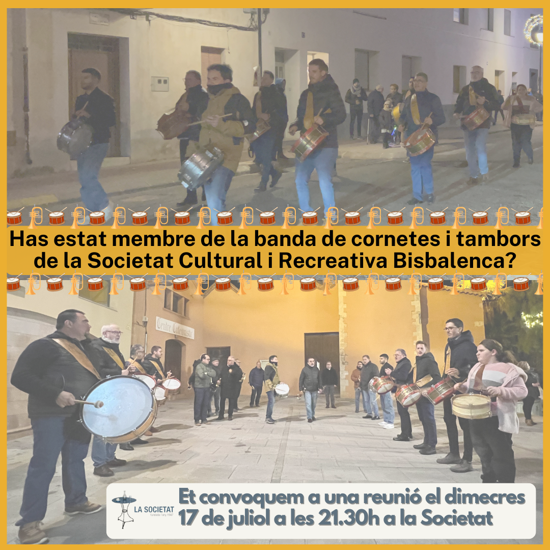 Has estat membre de la banda de cornetes i tambors? Estàs convocat o convocada a una reunió el pròxim dimecres 17 de juliol a les 21:30h.