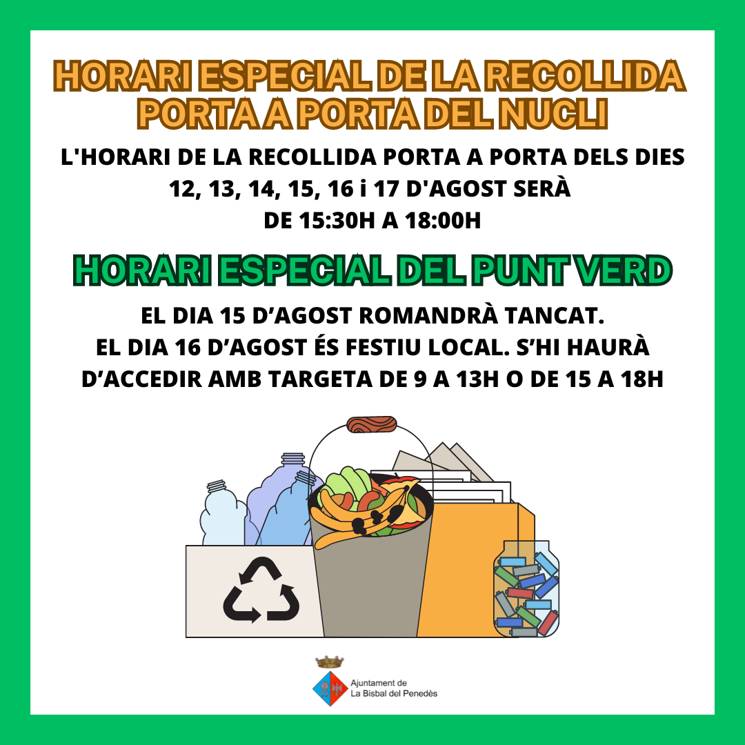 Horari especial del porta a porta al nucli i del Punt Verd durant la Festa Major