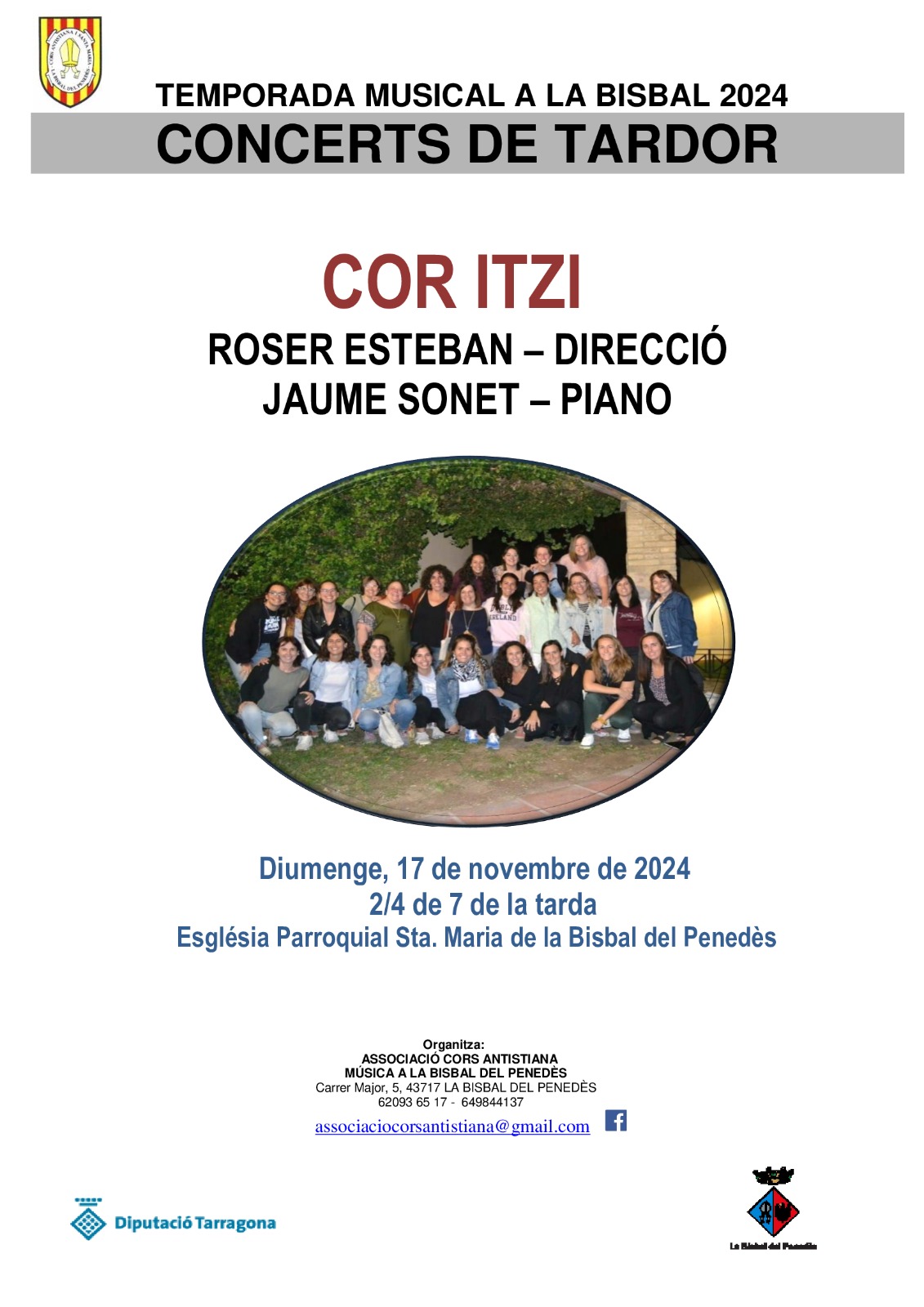 El domingo 17 de noviembre, a las 18.30h, el Cor Itzi ofrecerá un concierto en la Església Parroquial de Santa Maria bajo la dirección de Roser Esteban y con Jaume Sonet al Piano.