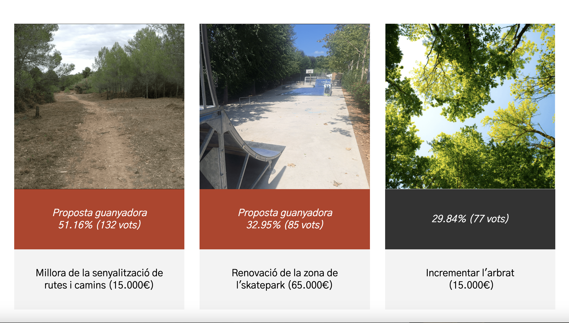 Les dues propostes més votades són la millora i senyalització de rutes i camins (amb 132 vots, és a dir, amb el 51% del total dels suports) i la renovació de la zona de l’skate amb 85 vots i el 33% dels suports. Tenint en compte que la primera proposta té un cost de 15.000€ i la segona un cost de 65.000€ i que, plegades, sumen 80.000€ -que és el pressupost total- les dues propostes s’executaran el 2025.