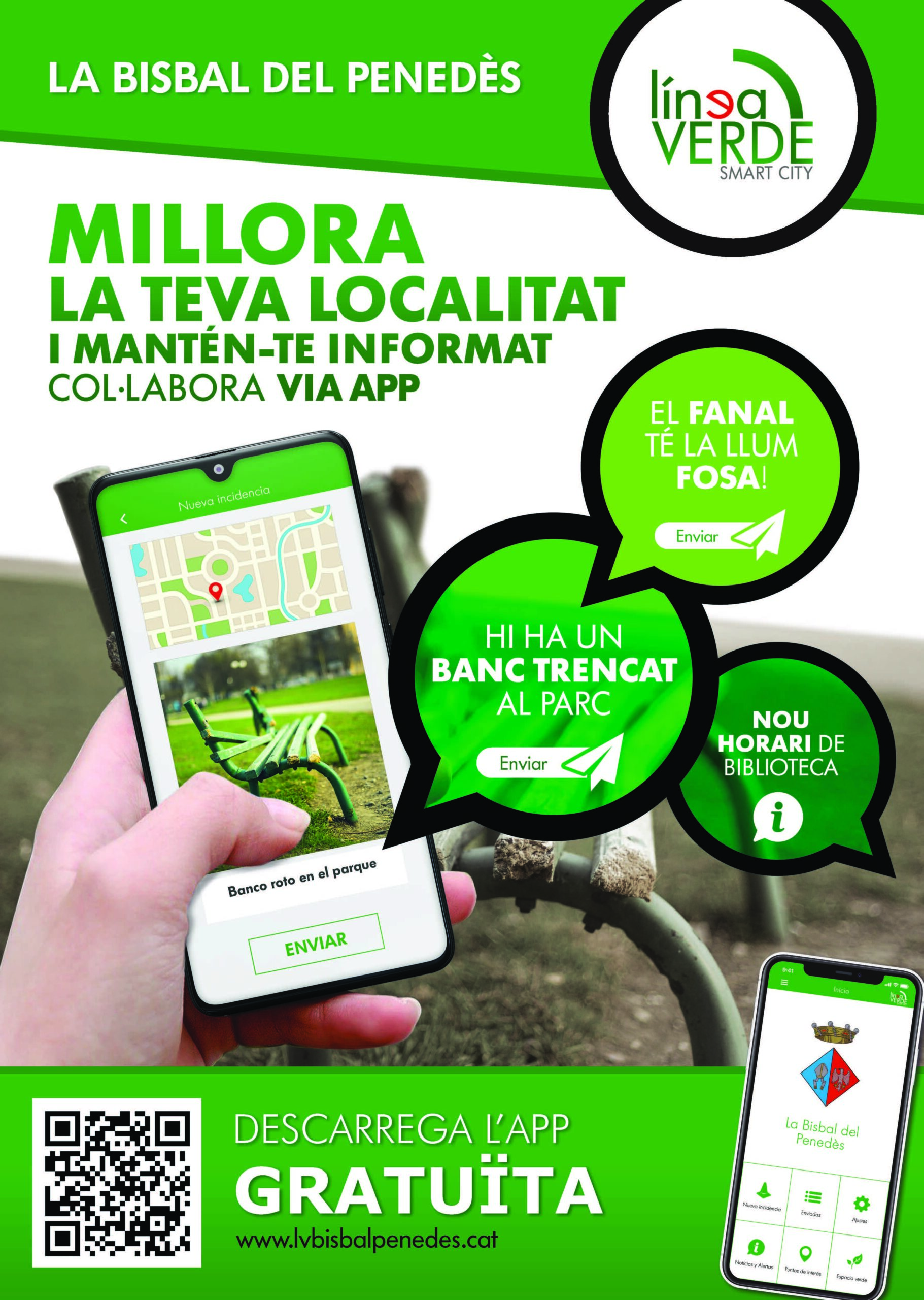 Para poder usar este servicio solo hay que proceder a la descarga gratuita de la app ‘Línea Verde’ a través de Google Play o App Store, en función de la tecnología que use el teléfono tipo smartphone del usuario (Android/iOS). Una vez descargada solo hay que seleccionar el municipio y ya se puede comenzar a utilizar. Para comunicar una incidencia hay que pulsar sobre “Nueva incidencia” y elegir su tipología. Se pueden elegir temas relacionados con aceras y carreteras, alcantarillado, alumbrado, residuos, mobiliario urbano, parques y jardines, puntos de agua, señales y semáforos, limpieza, plagas de insectos y roedores, animales abandonados, retirada de vehículos, tráfico y movilidad, vandalismo y otros. La aplicación también dispone de información sobre temas medioambientales como las buenas prácticas, consejos o información del municipio relacionada con Medio Ambiente y Gestión de Residuos. Cabe decir que también se pueden comunicar incidencias o solicitar información a través de la web www.lvbisbalpenedes.cat. Por otro lado, Línea Verde ofrece un servicio de información gratuito sobre temas relacionados con medio ambiente a través del teléfono 902 193 768, de 8 a 17h (coste de la llamada, 0,07€/min).