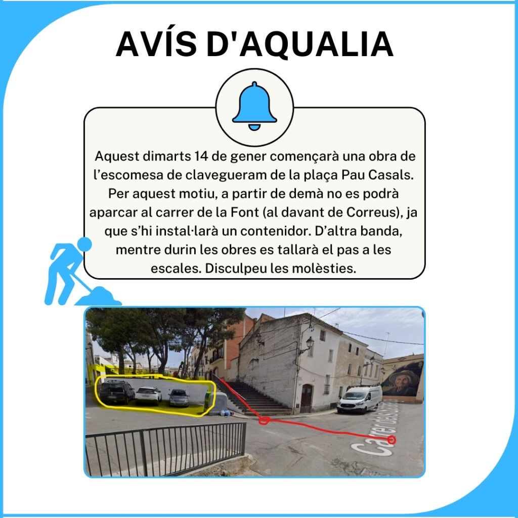 Aquest dimarts 14 de gener començarà una obra de l’escomesa de clavegueram de la plaça Pau Casals. Per aquest motiu, a partir de demà no es podrà aparcar al carrer de la Font (al davant de Correus), ja que s’hi instal·larà un contenidor. D’altra banda, mentre durin les obres es tallarà el pas a les escales. Disculpeu les molèsties