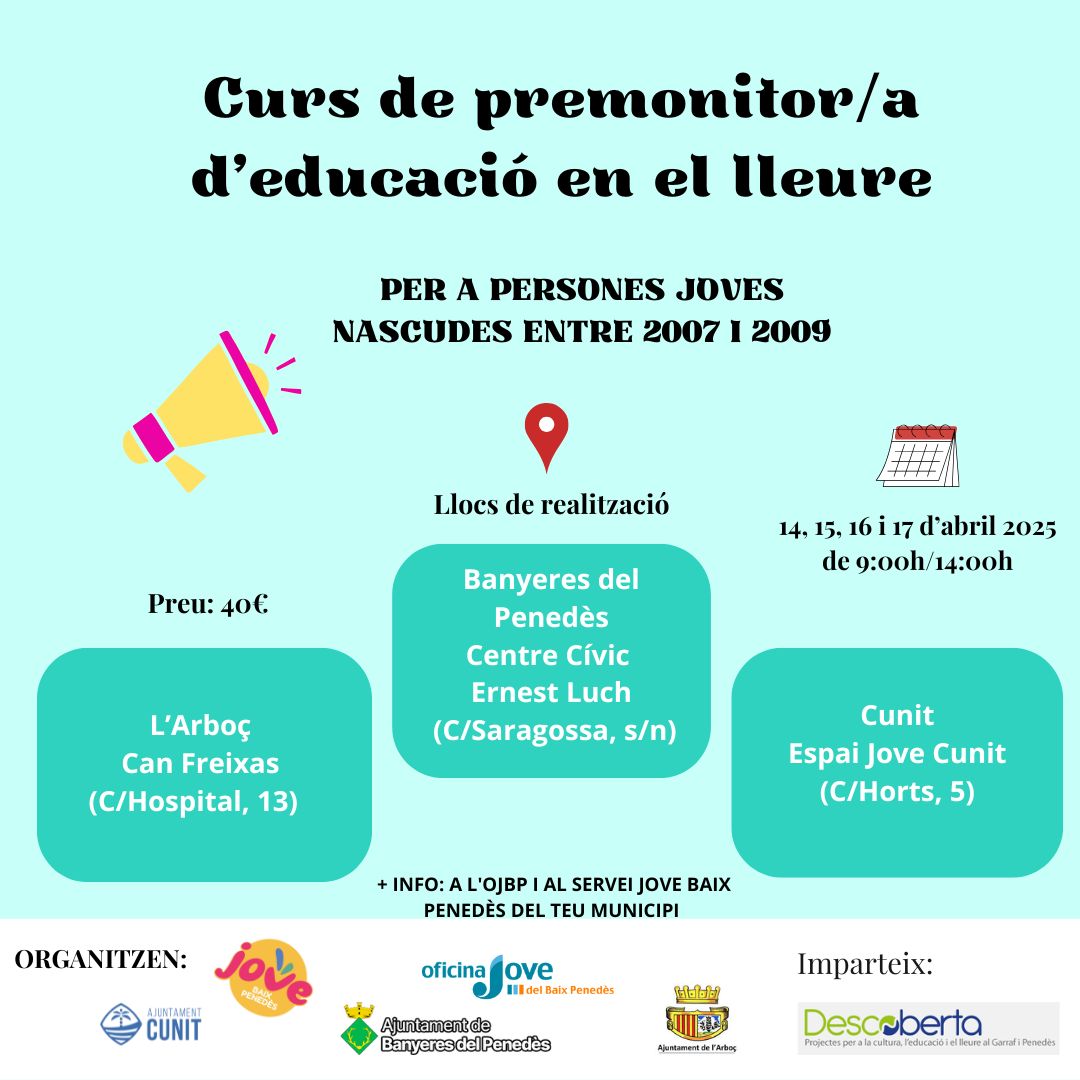 Un any més, l’Oficina Jove del Baix Penedès promou els curos de premonitors/es d’educació en el lleure per a persones joves, en aquest cas, nascudes entre el 2007 i el 2009. La formació es durà a terme durant les vacances de Setmana Santa (del 14 al 17 d’abril) i els cursos es faran a l’Arboç, Banyeres del Penedès i Cunit, en horari de 9 a 14h. Les preinscripcions comencen el dilluns 10 de març i les podeu fer a la Cova Jove o adreçant-vos a l’Oficina Jove Baix Penedès (El Vendrell). El preu d’aquesta formació és de 40€.