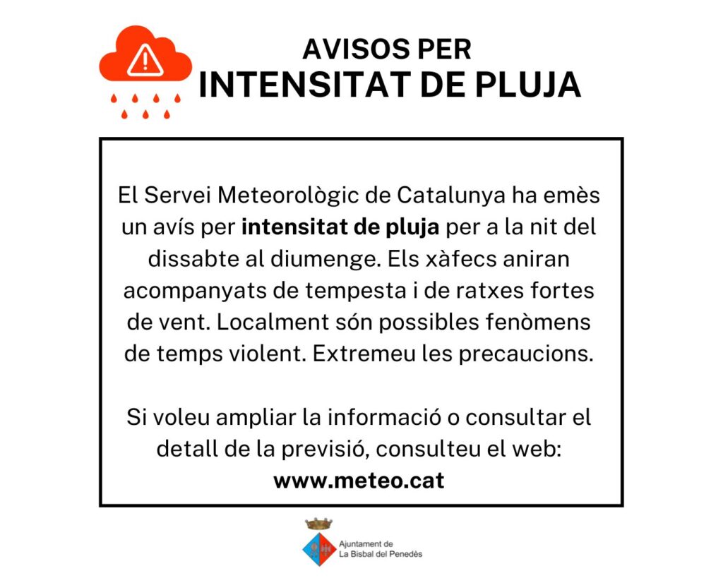 El Servei Meteorològic de Catalunya ha emès un avís per intensitat de pluja per a la nit del dissabte al diumenge. Els xàfecs aniran acompanyats de tempesta i de ratxes fortes de vent. Localment són possibles fenòmens de temps violent. Extremeu les precaucions.