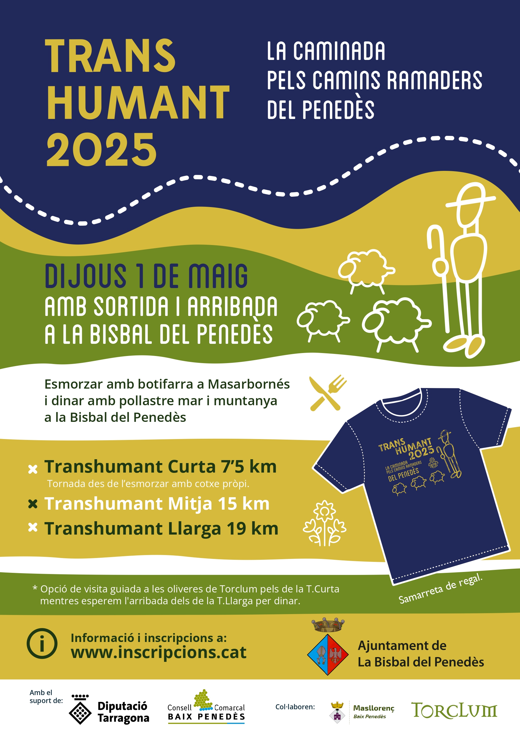 El jueves 1 de mayo podréis disfrutar de la caminata por los caminos ganaderos del Penedès con una degustación de productos y de la gastronomía del territorio. Tenéis tres opciones de ruta, todas ellas con recogida de camiseta conmemorativa de 7:30h a 8:15h y salida a las 8:30h desde el Centre Municipal de Cultura de la Bisbal del Penedès (plaça Major, 11-15):