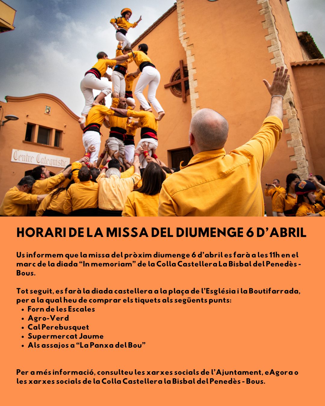Us informem que la missa del pròxim diumenge 6 d’abril es farà a les 11h en el marc de la diada “In memoriam” de la Colla Castellera La Bisbal del Penedès – Bous